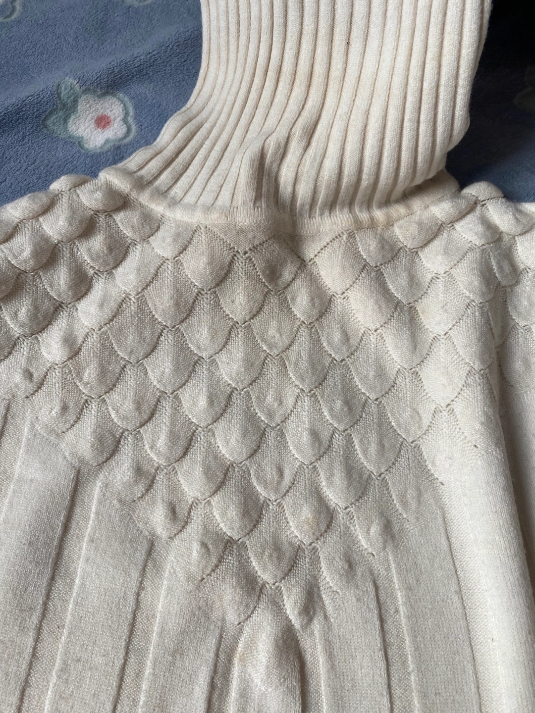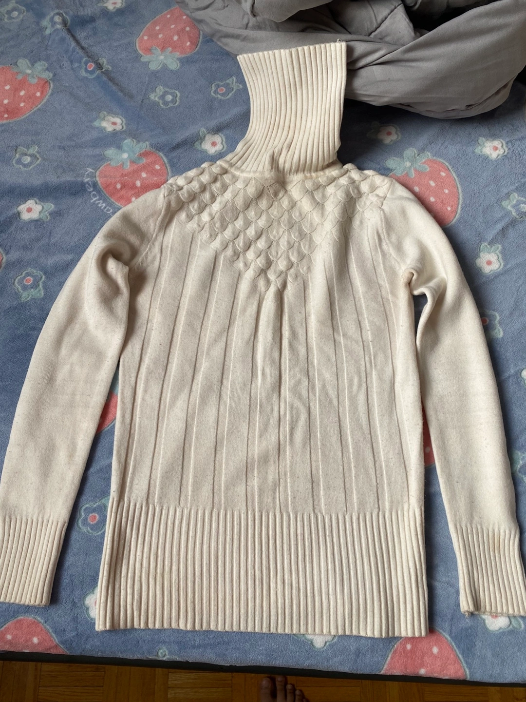 Women's off-white turtleneck sweater. Long sleeves. Cable knit detailing on the front. Ribbed turtleneck and cuffs. Soft knit material.