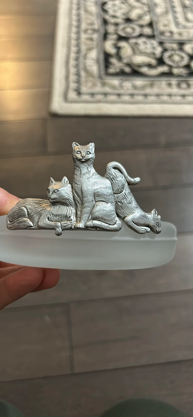Frosted glass dish with a pewter decorative cat accent. "© 2000", "Brummel & Smith, Paramount, Canada" visible on pewter. Dish has a slightly frosted finish.