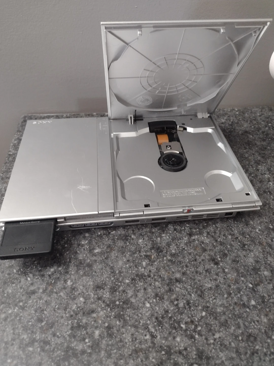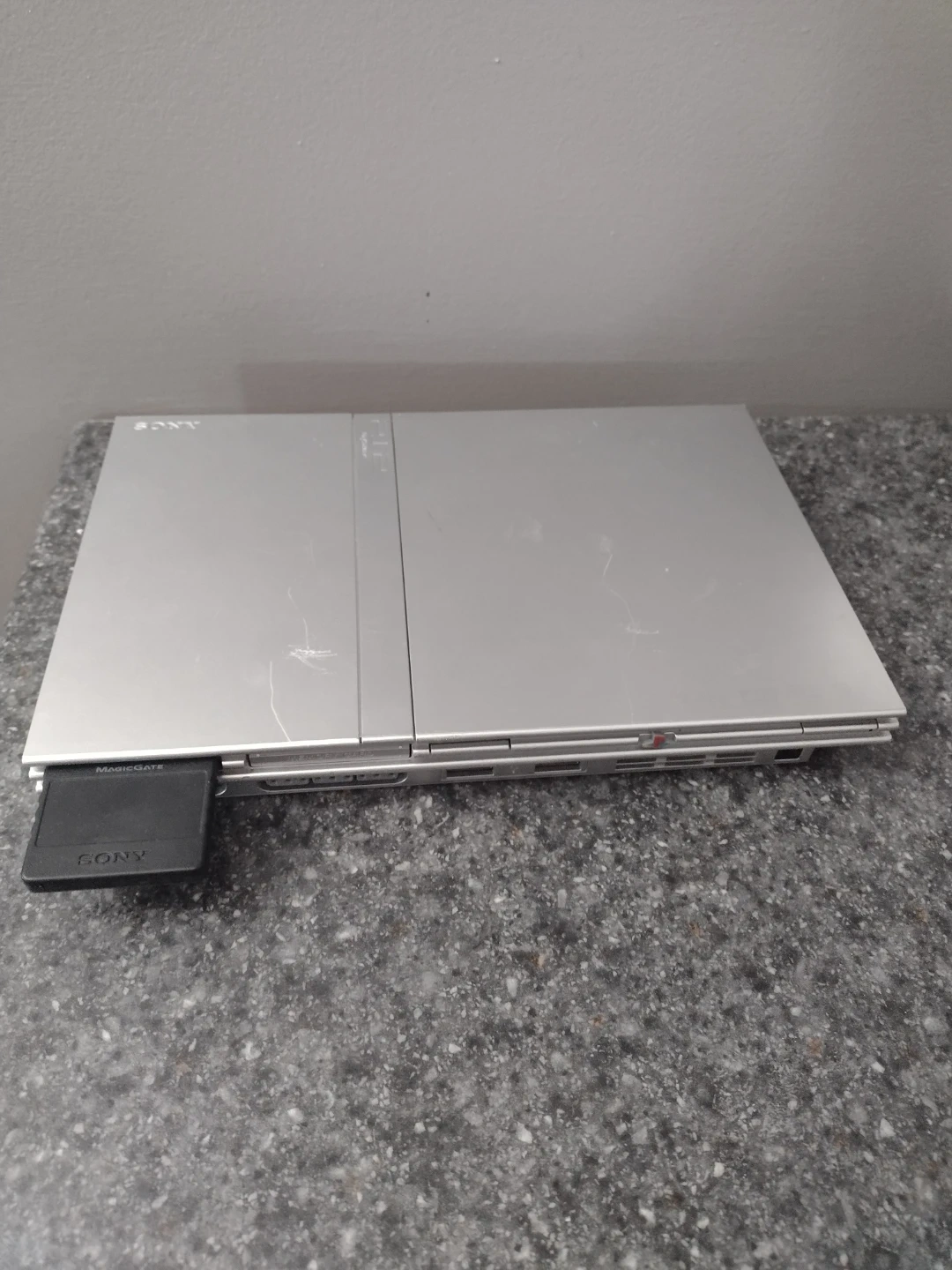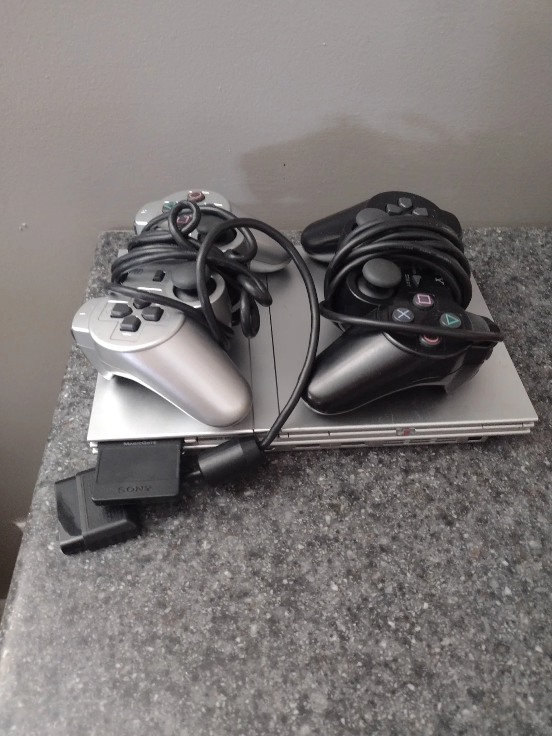 Silver Sony PlayStation 2 console. Includes two controllers, one silver and one black, and a MagicGate memory card. Disc drive opens and closes.