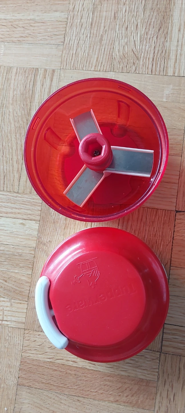 This is a red Tupperware speedy chopper. It features a manual pull cord for chopping ingredients. Great for quickly dicing onions or herbs!