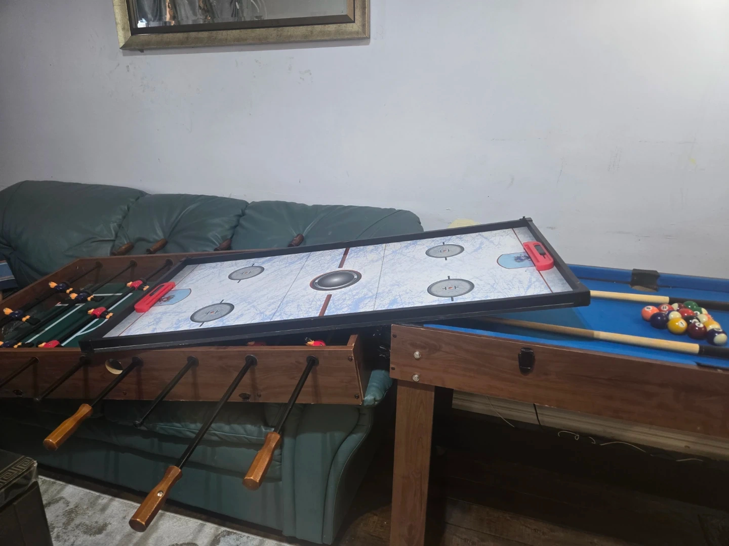 All in one Selling a multi-game table that includes pool, air hockey, and foosball! It's a great way to have some fun at home with friends and family. Perfect for game nights or just some casual entertainment