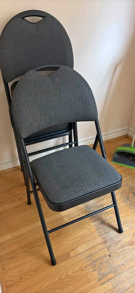 Sturdy folding chairs with grey herringbone patterned upholstery and black metal frames. Set includes two chairs with padded seats and curved backrests for comfort. Metal legs have protective floor caps.