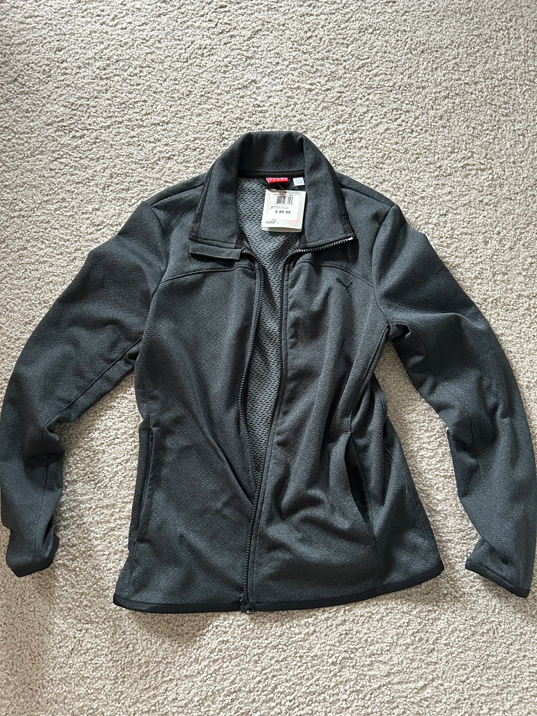 Grey puma jacket with a full zipper. It has a mesh lining. The jacket has two zippered pockets. The sleeves are long and the cuffs are ribbed. The jacket has a stand up collar. There is a small logo on the left side of the chest.