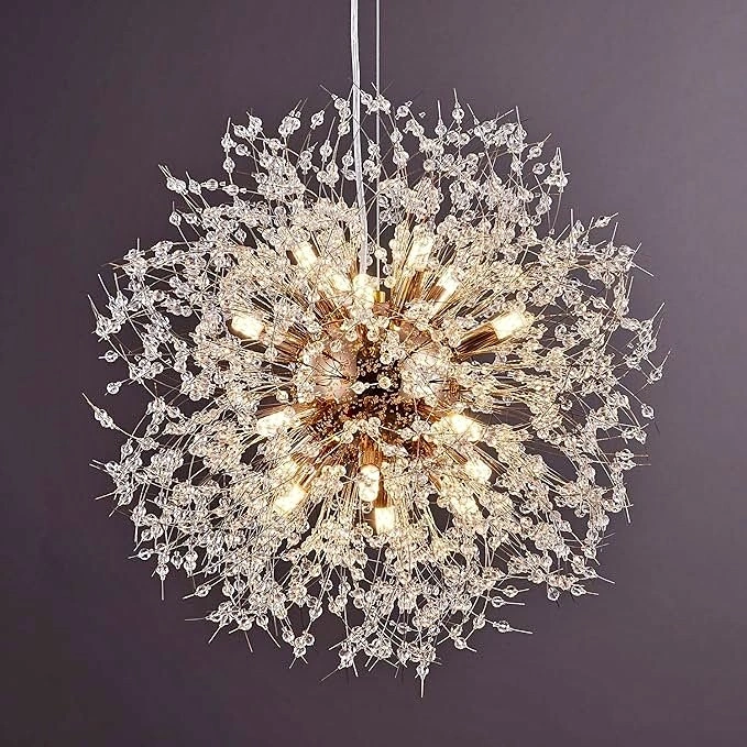 This 12-light chandelier makes a dynamic statement while boldly illuminating any room with contemporary style. Crafted from metal with a polished finish, it consists of a sphere at the center while 12 rods extend outward in multiple directions for a Sputnik-inspired look. At the end of each one is an exposed, dimmable bulb (sold separately) as a circular web of small beaded crystal accents reflect light throughout the piece and surrounding space. This chandelier hangs with the help of a height-adjustable cord and a canopy that's compatible with sloped ceilings.