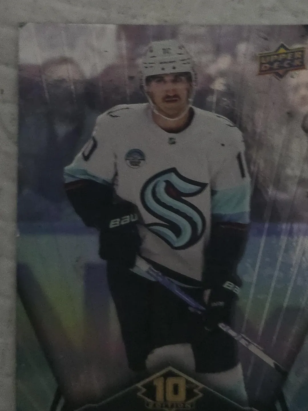 This is a 2022-23 Upper Deck hockey card featuring a player from the Seattle Kraken. The card shows the player in their home jersey. It's a great addition to any hockey card collection. This card is from the Upper Deck brand.