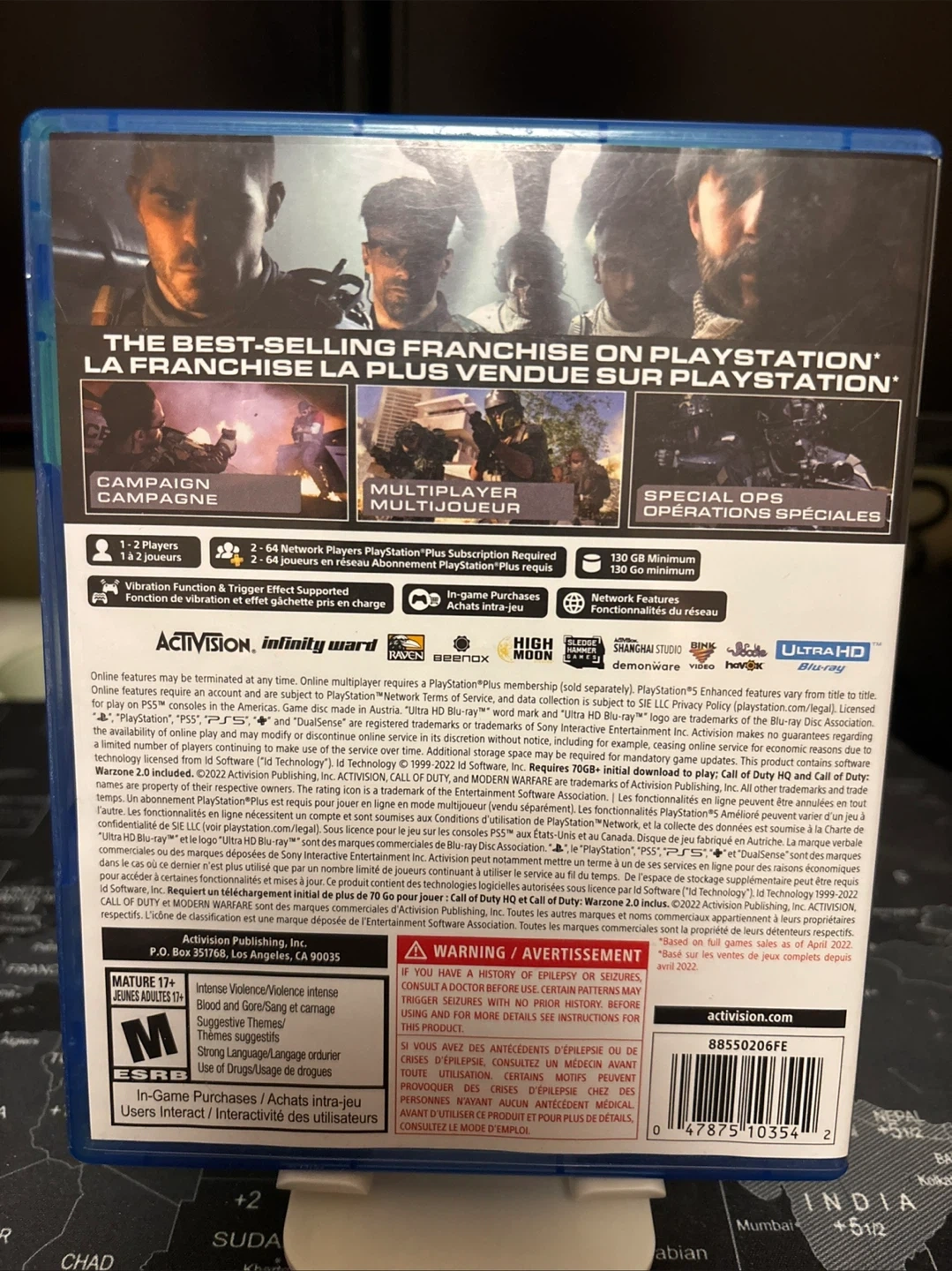 This is Call of Duty: Modern Warfare II for PlayStation 5 and PlayStation 4. It includes campaign, multiplayer, and special ops modes. The game disk is included in the case.