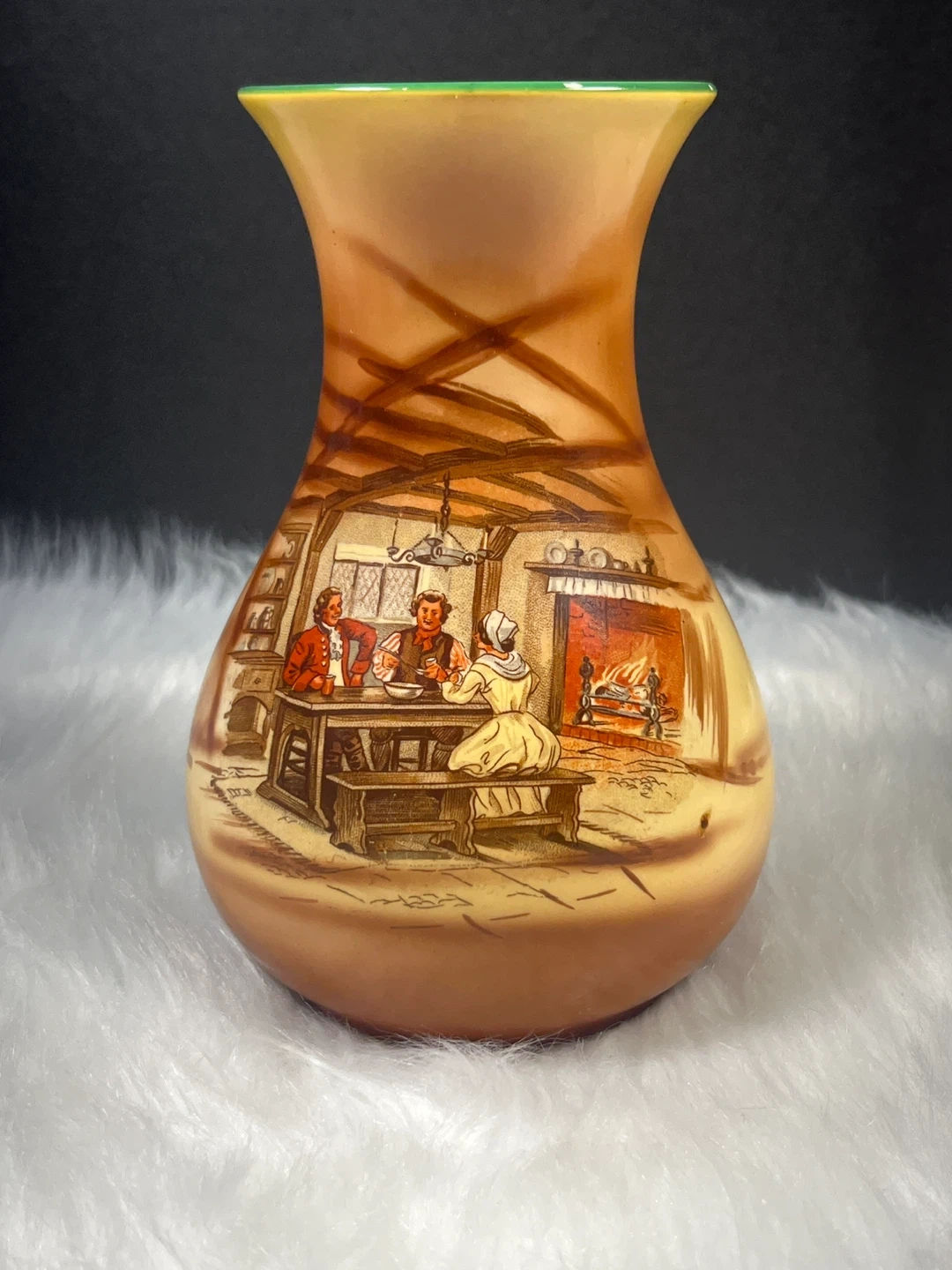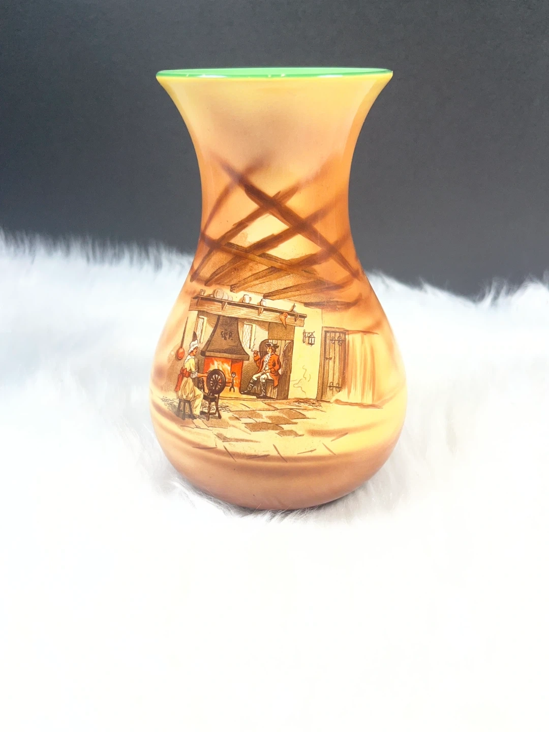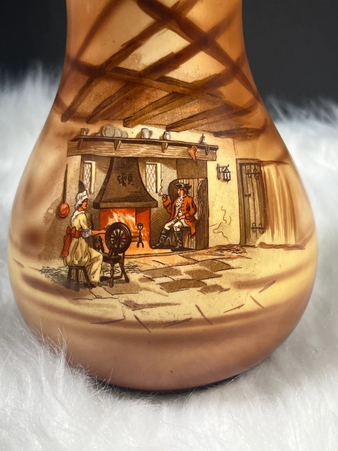 Scene: The hand-painted scene depicts a traditional English interior, often referred to as a "coaching scene" or tavern interior, featuring a woman at a spinning wheel and a man by a fireplace.