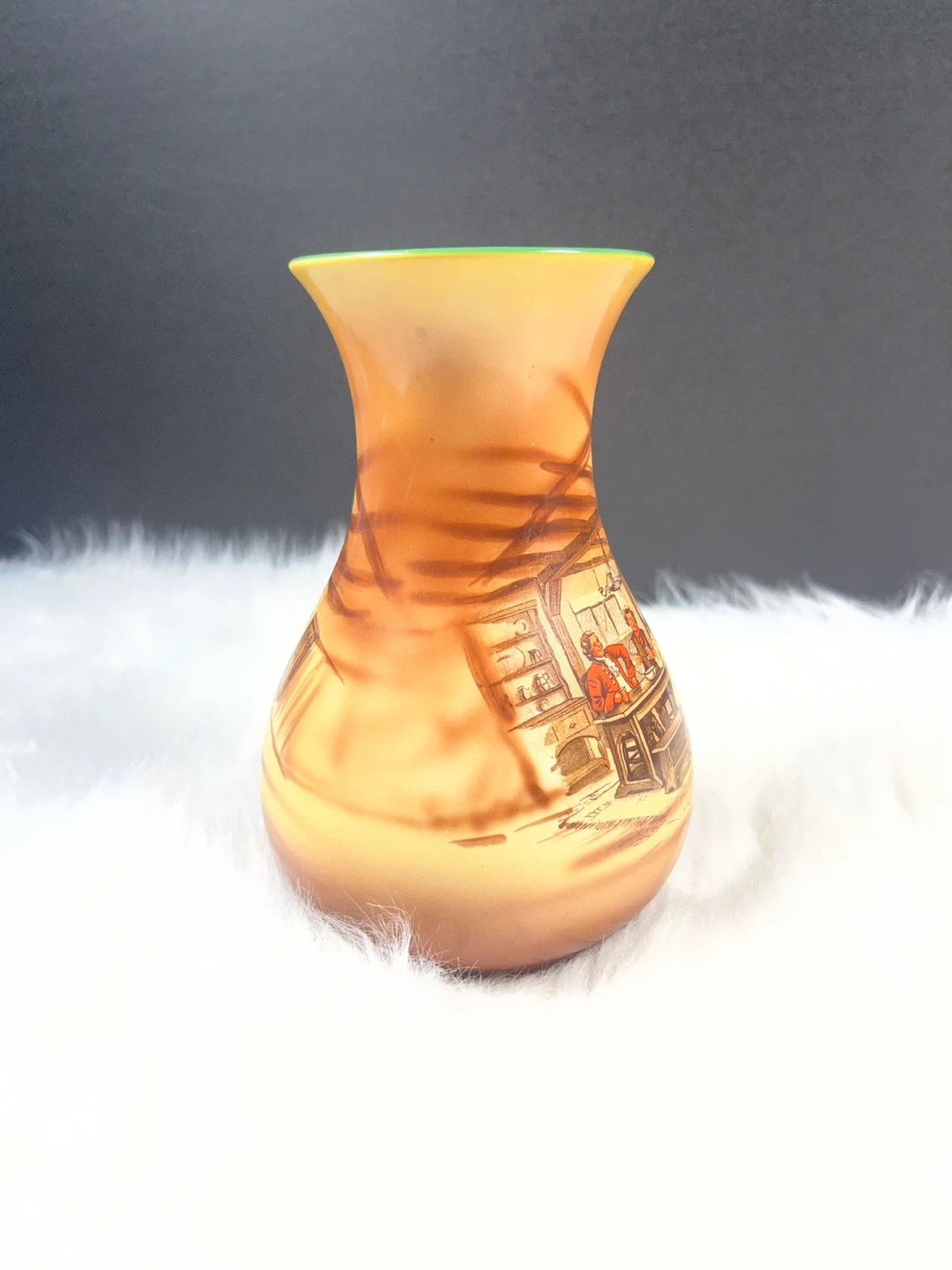 Style: The vase has a distinctive warm amber/yellow and brown glaze, typical of Falcon Ware pieces from this era.