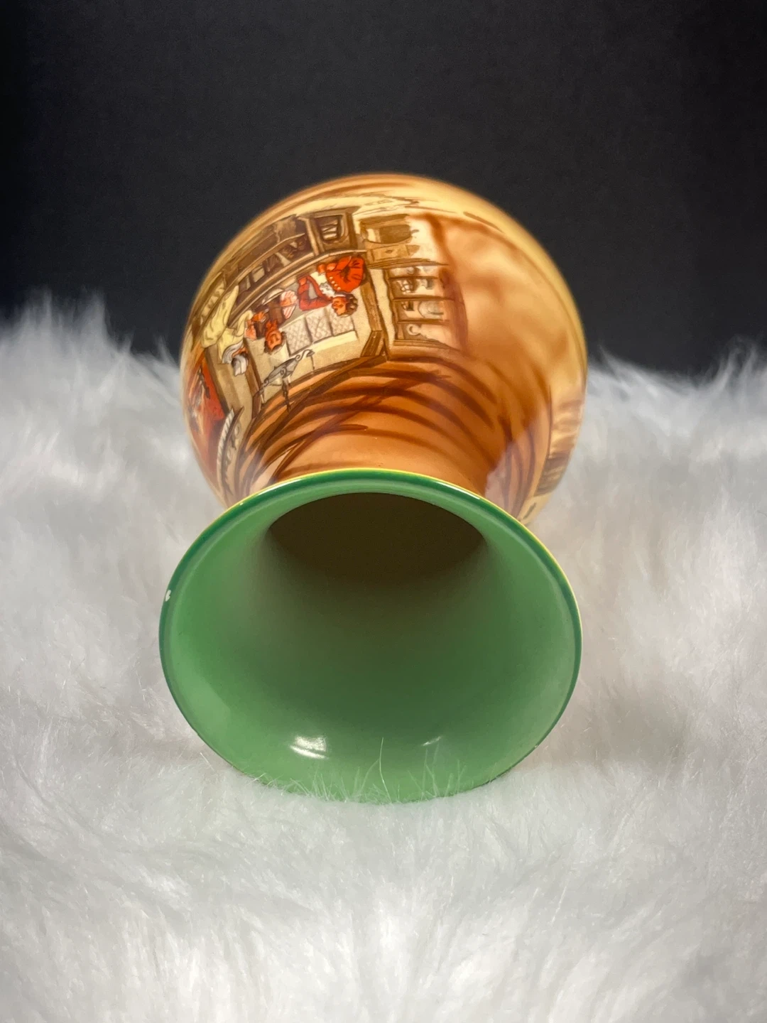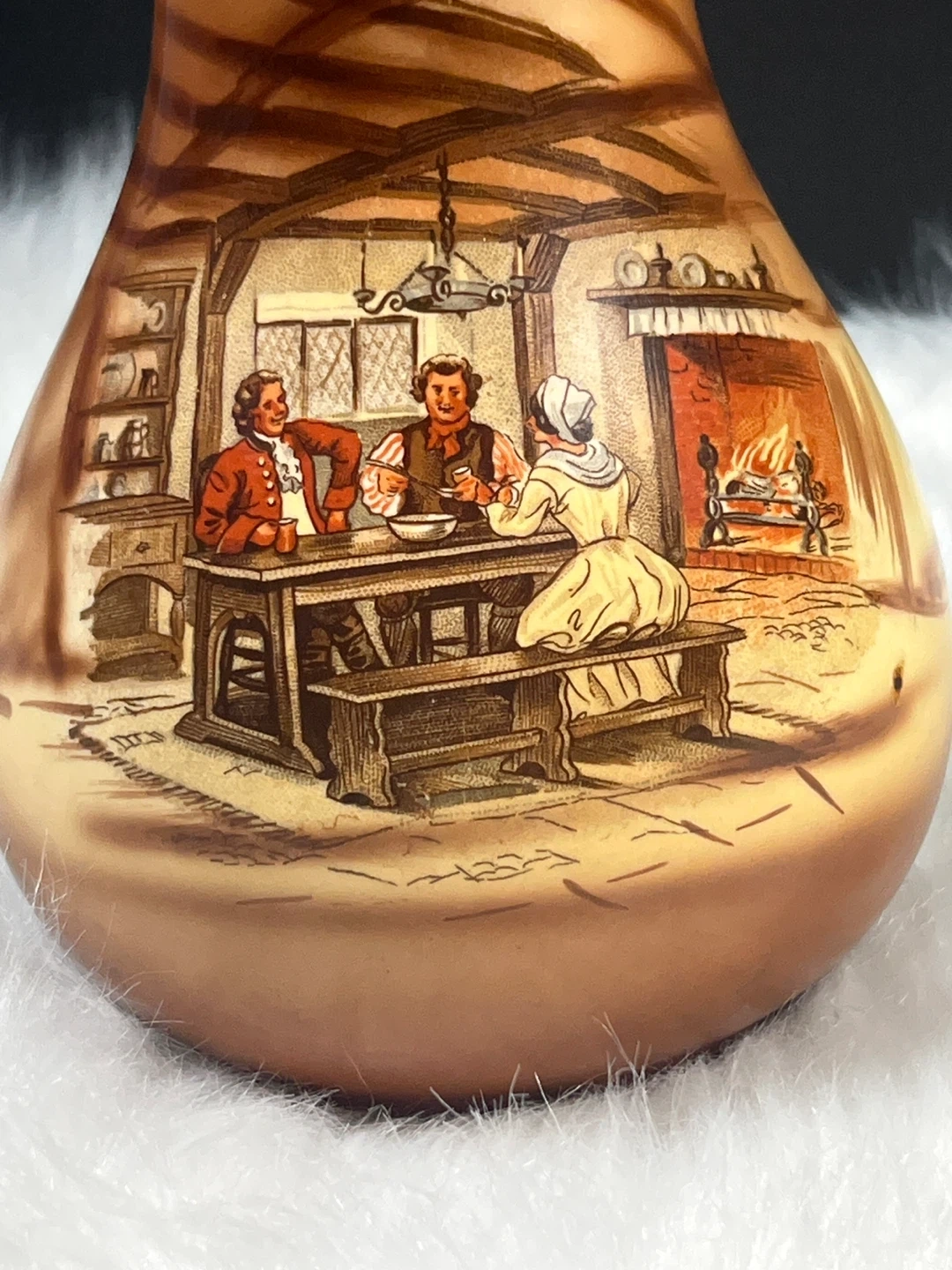 Scene: The hand-painted scene depicts a traditional English interior, often referred to as a "coaching scene" or tavern interior, featuring a woman at a spinning wheel and a man by a fireplace.