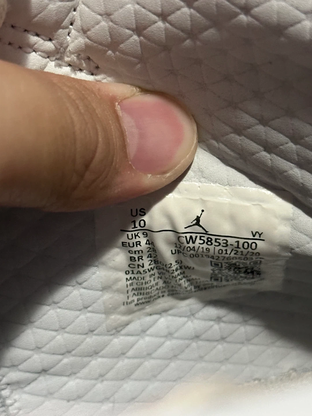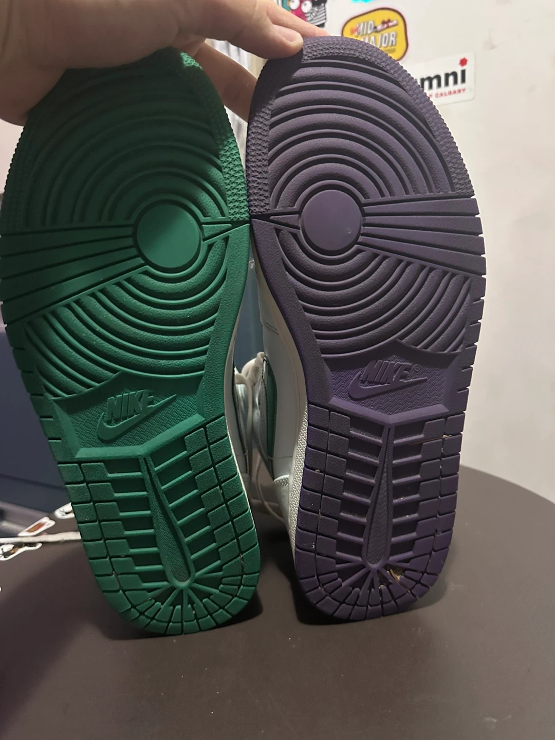 These are a US size 10 and feature a unique purple and green colourway on the soles. The model number is CW5853-100. They're in great condition and ready for a new home!