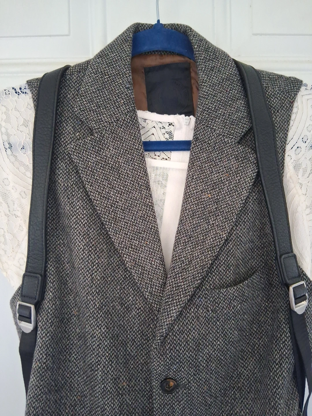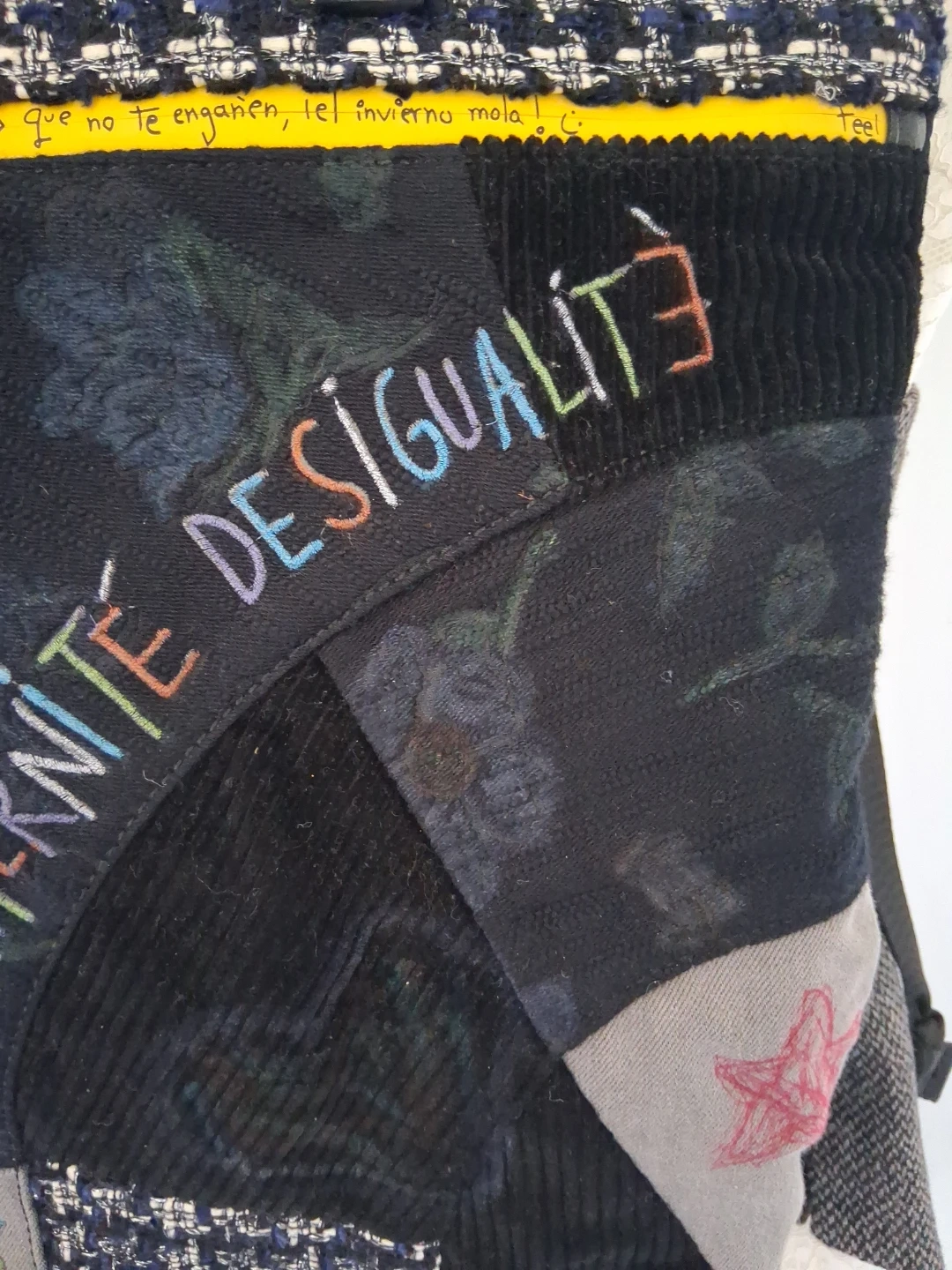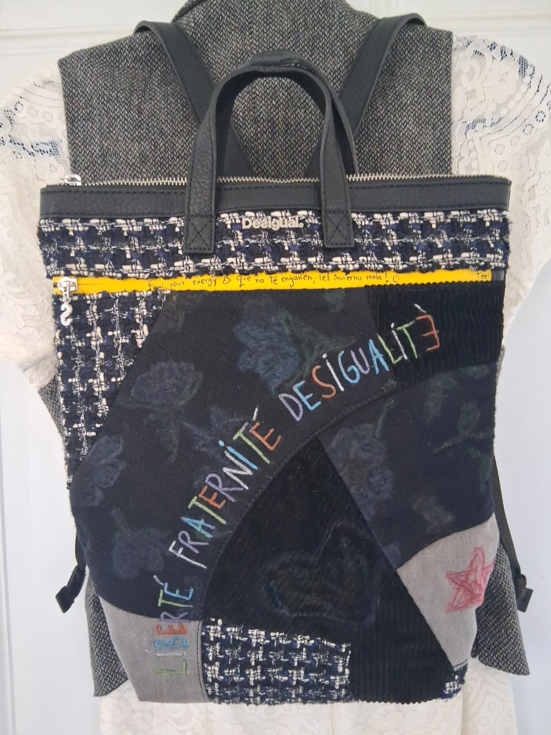 NewDesigual backpack with a patchwork design. It features a tweed-like fabric and a large embroidered front panel with the text "FRATERNITÉ DESIGUALITÉ". Includes a yellow accent zipper. The back has black nylon with leather adjustable straps and handles.