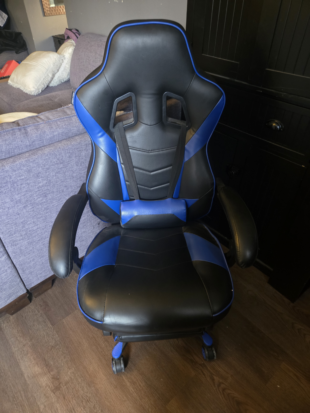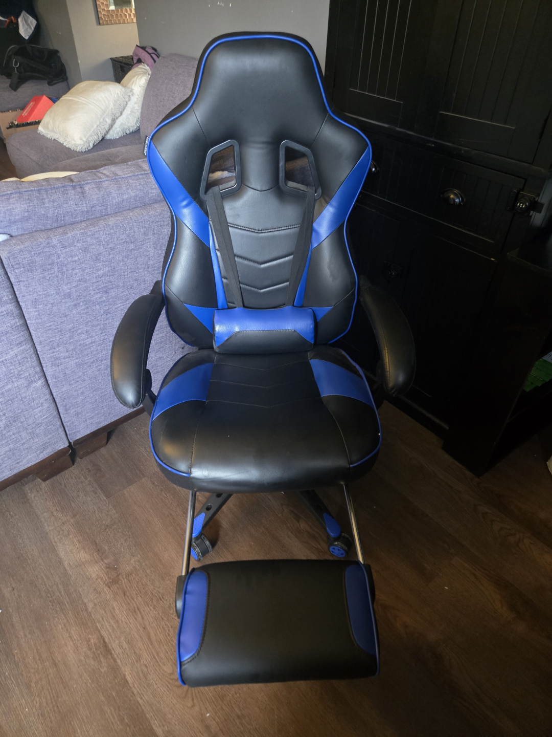 Comfortable gaming chair, black and blue colour scheme. Features adjustable height and a footrest. Excellent for long gaming sessions or working from home.