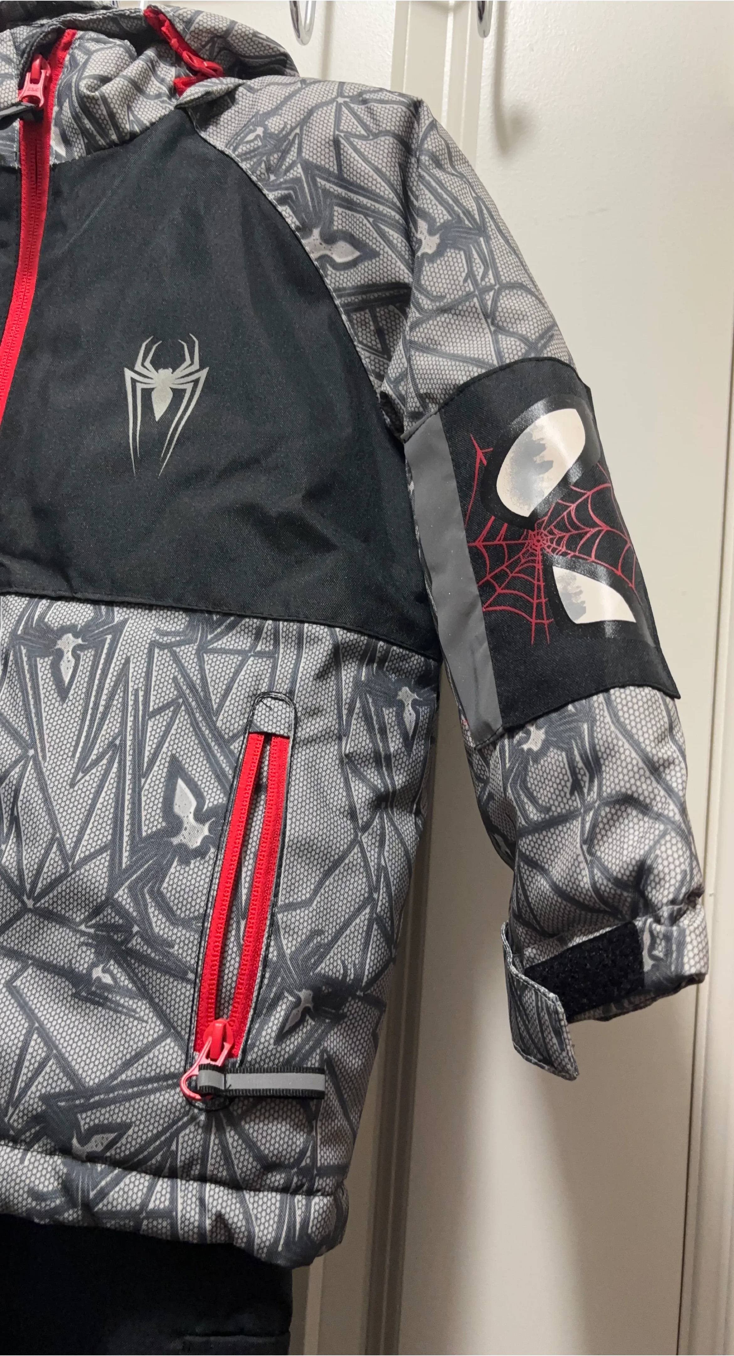 Selling a Spider-Man snowsuit for kids! It's in great condition and perfect for keeping your little one warm during the winter. The snowsuit is a size 4 and features a cool Spider-Man design with red accents. Ready for some snowy adventures!