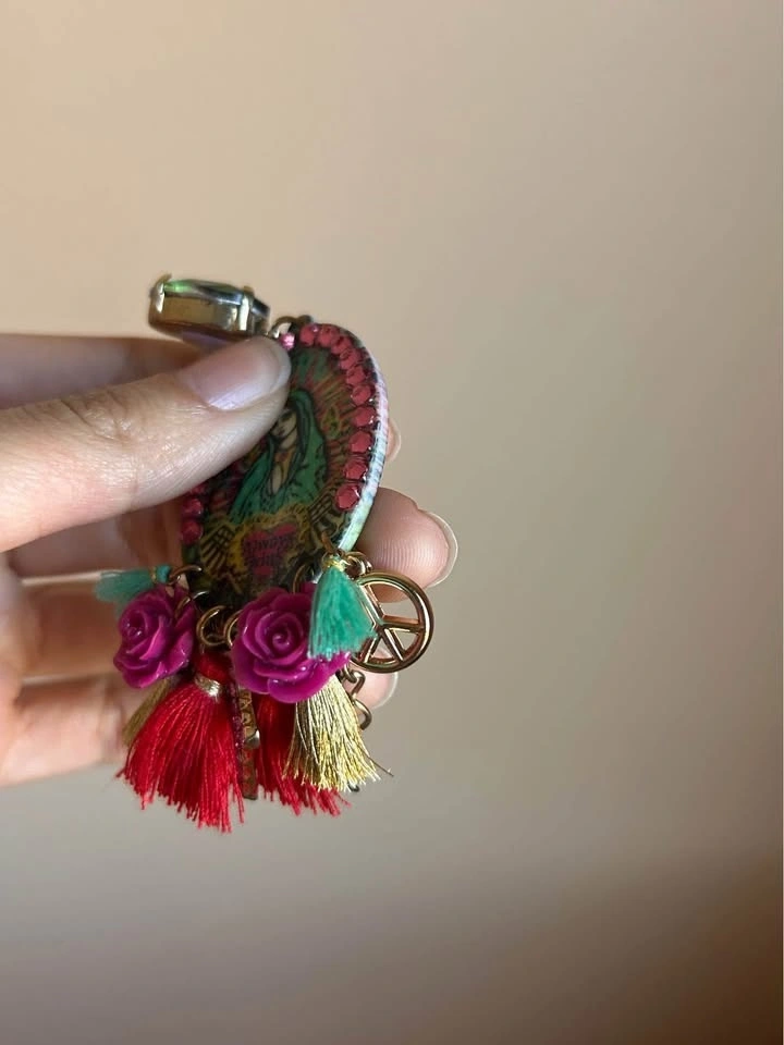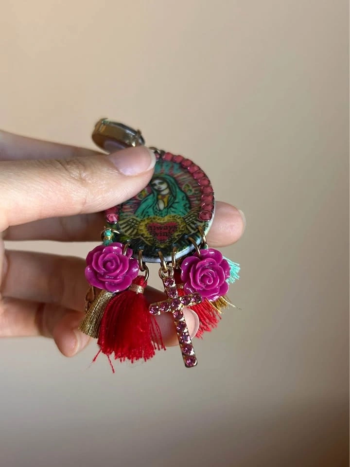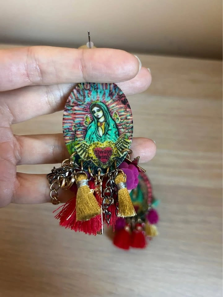 Custom Mother Mary artwork and custom made earrings by an artist. Religious motif and cross, peace, tassel charms.