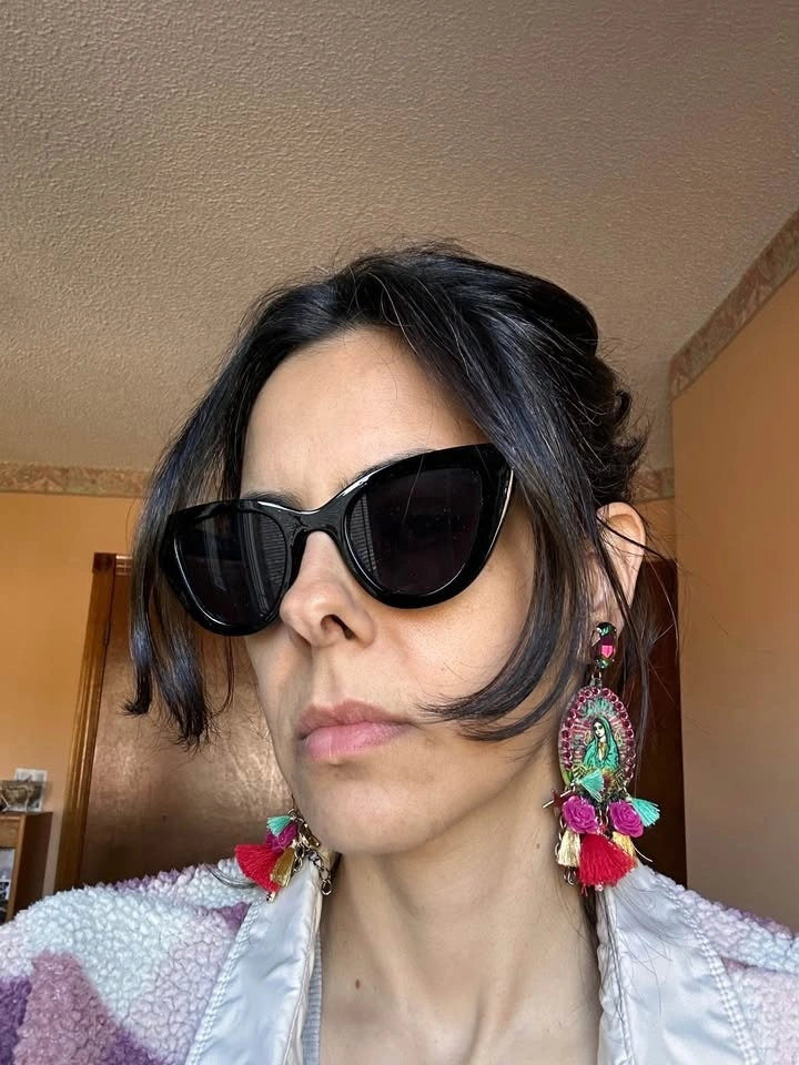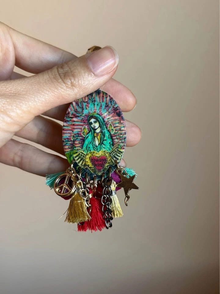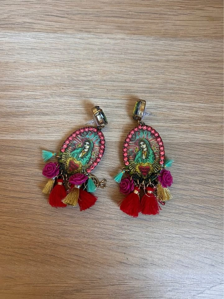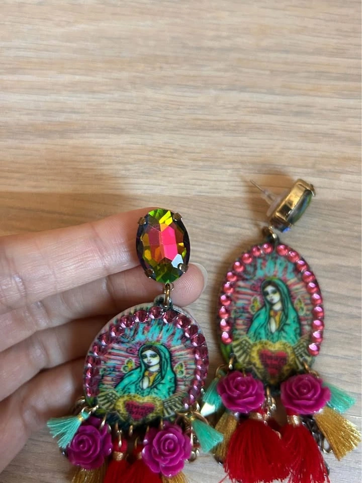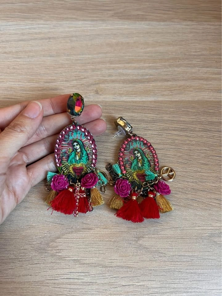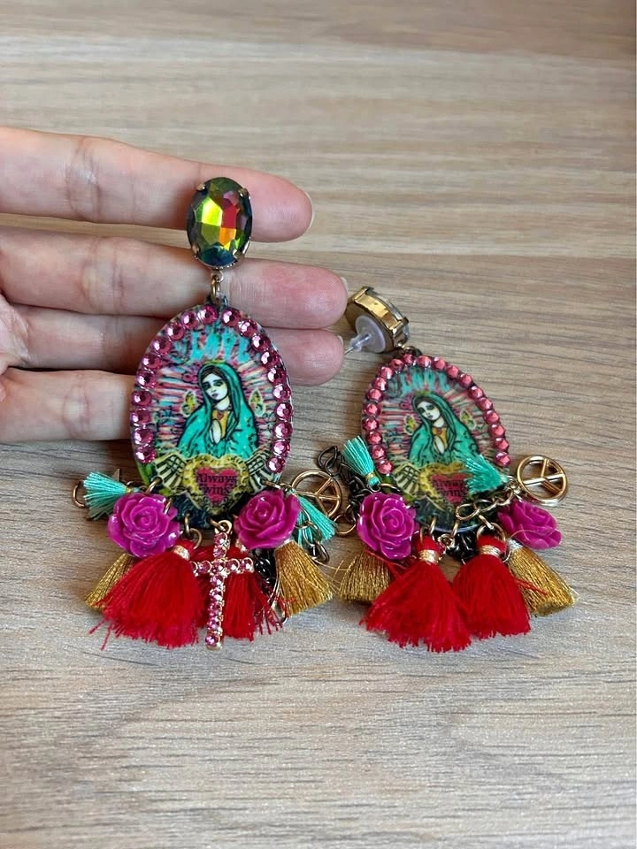 Custom Mother Mary artwork and custom made earrings by an artist. Religious motif and cross, peace, tassel charms.