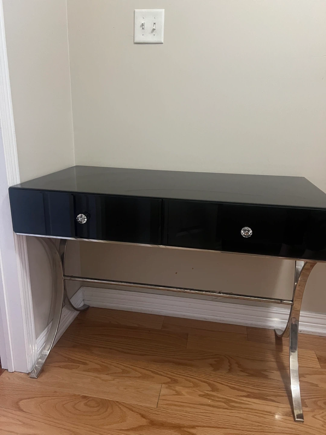 Sleek black vanity desk with a glossy top and two drawers. Features stylish crystal-like drawer knobs and chrome legs. Perfect for a vanity or as a small writing desk.