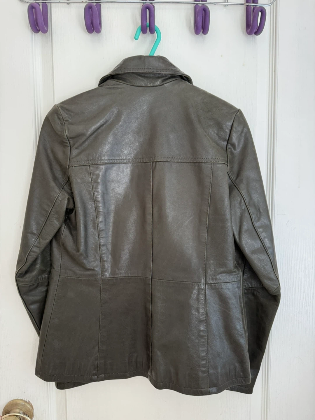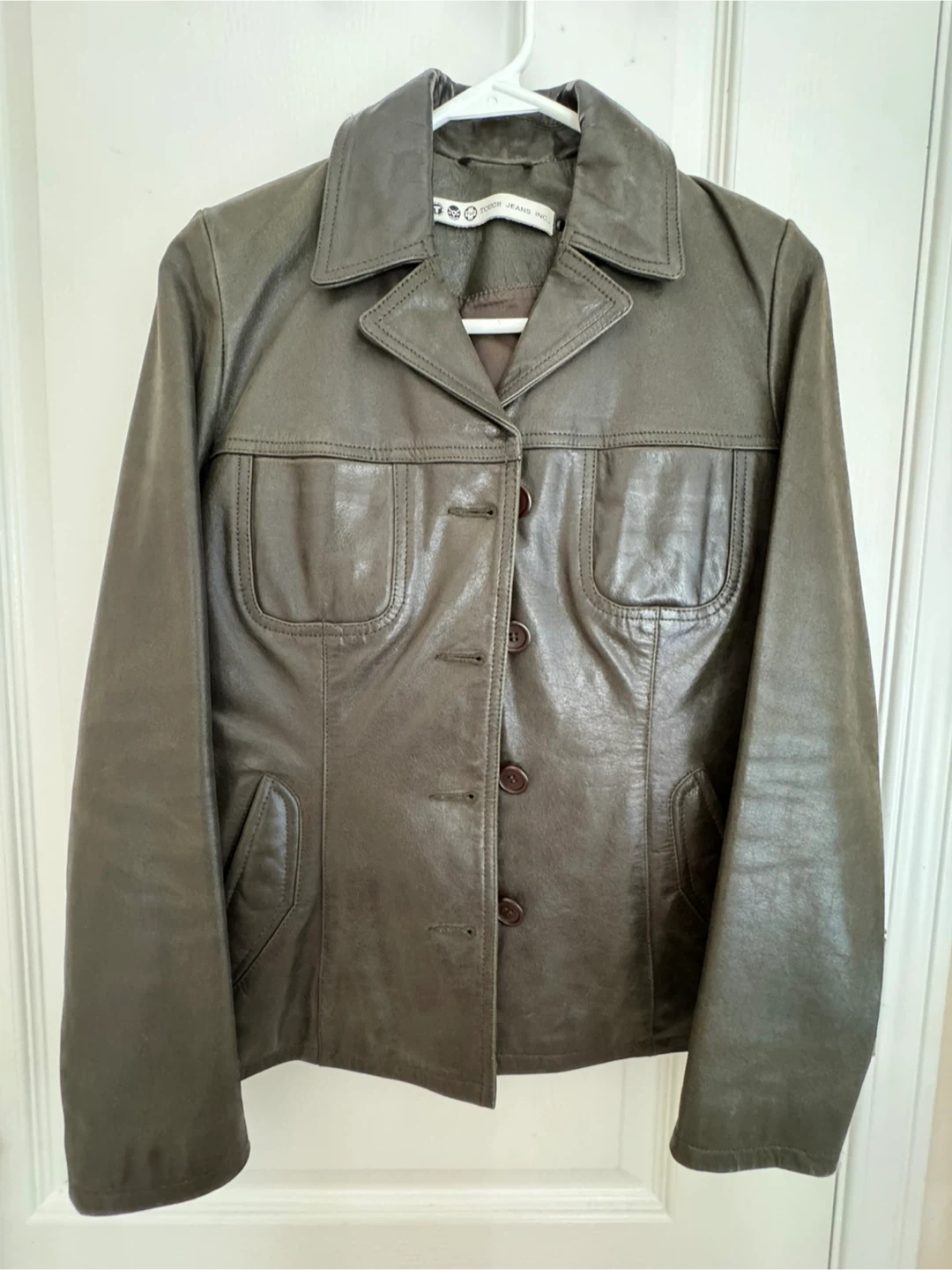 15Here's a stylish Tuzzi Jeans leather jacket in a unique olive green colour! It's made of genuine leather and has a classic button-up design. Perfect for adding a touch of sophistication to your wardrobe