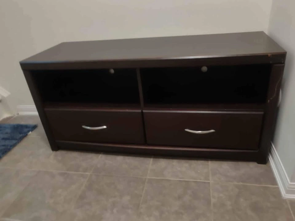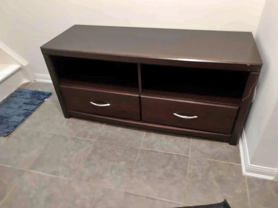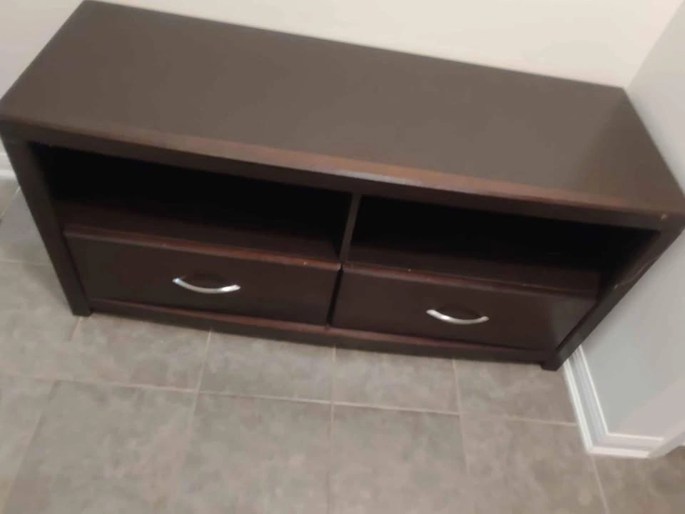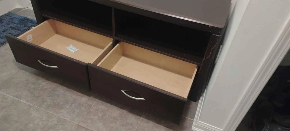 77TV Cabinet with 2 Drawers ample storage and 2 Shelves adjustable. Solid wood got it for a higher price. Heavy to move to the top floor. Since we don't have a lift, we decided to let go. Need team lift assist to move if you are living in a tall rise building.