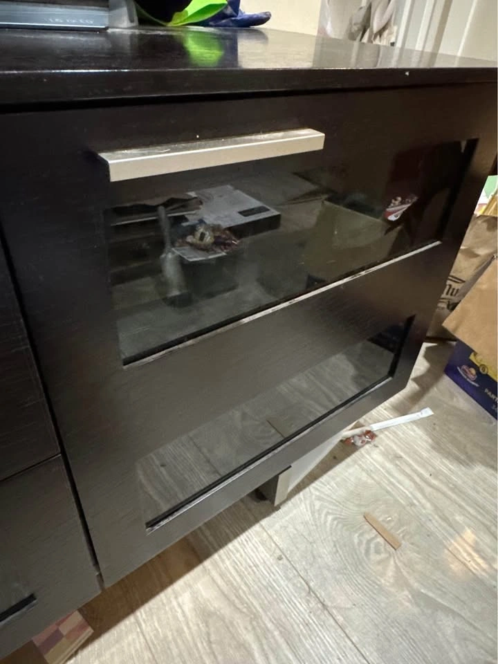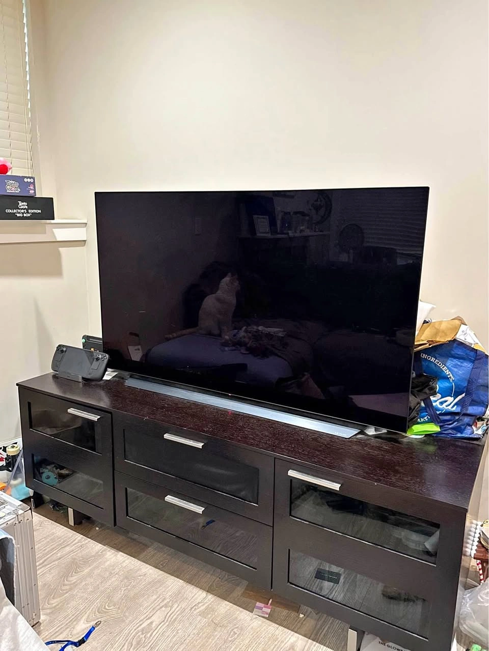 60Used and in good condition, has great storage utility. Doors have glass panes except for the top drawer which is a mesh-like consistency (if you want to store speakers there). Only selling the console, not the TV. Height - 23 Inches, Length - 65 Inches, Width - 22 Inches