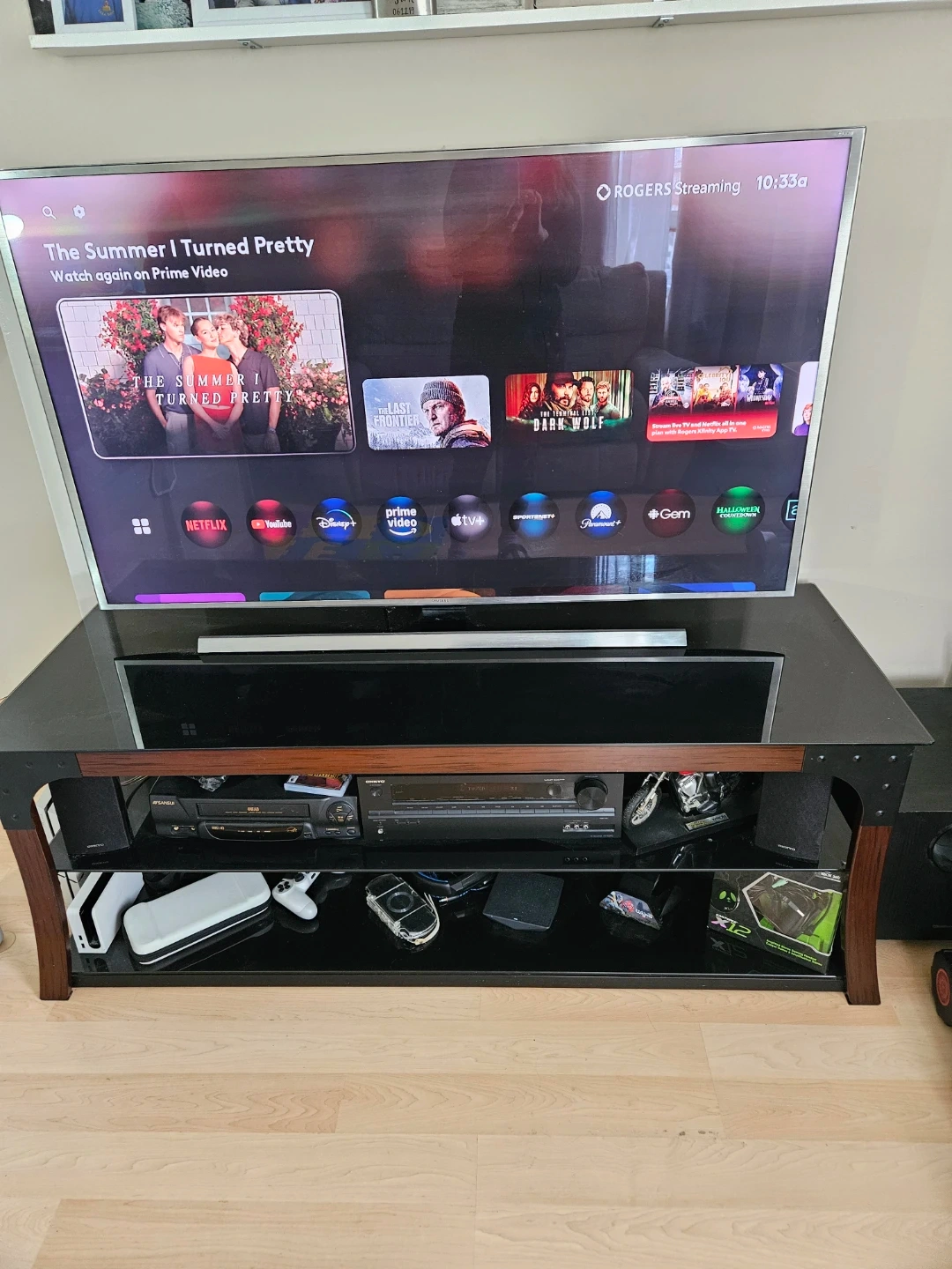 10Selling a TV stand in great condition! It has a sleek design with a black glass top and shelves, and dark wood accents. It offers plenty of space for your TV and media components. Perfect for organizing your entertainment area!