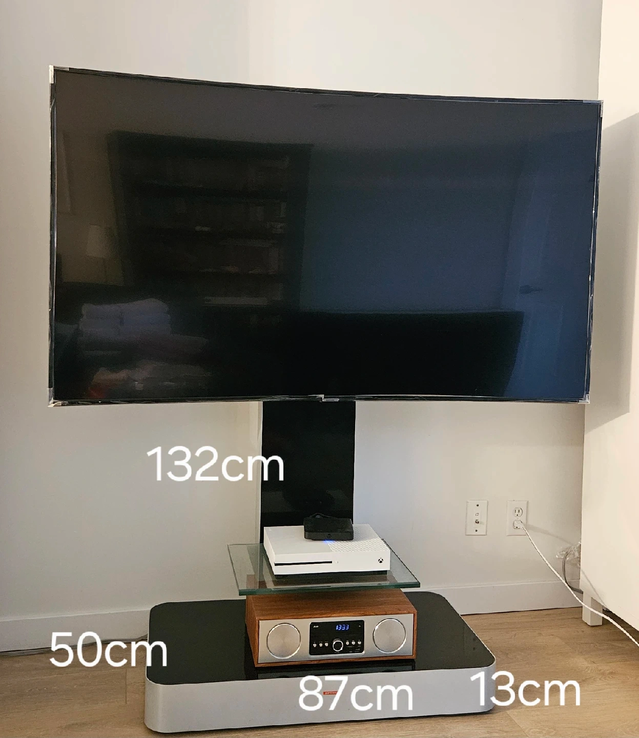 49This is a stylish TV stand. Its solid base provides stability, and small wheels allow for easy angle adjustment and movement. The TV can be adjusted up and down in increments of about 10cm. The glass shelf is convenient for elevating AV devices. My current TV is 65 inches, but it should easily fit up to 80 inches. This will transform your space into a stylish and convenient space.It's in great condition and ready to enhance your viewing experience! -TVs and other home appliances are not sold together. We only sell TV stands.-