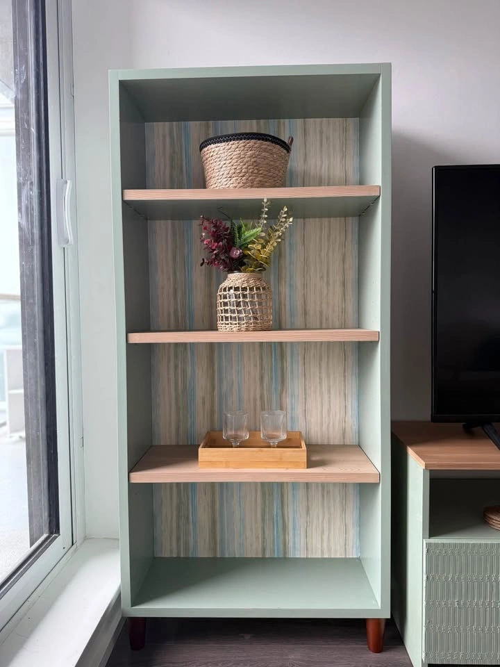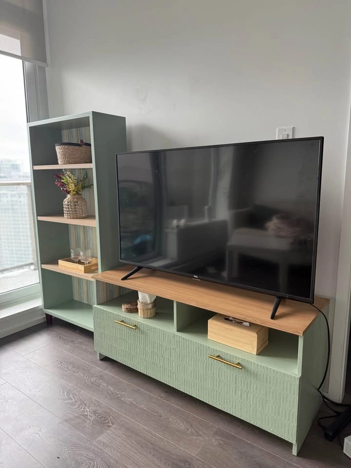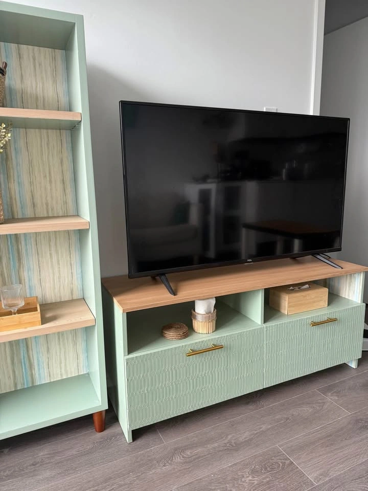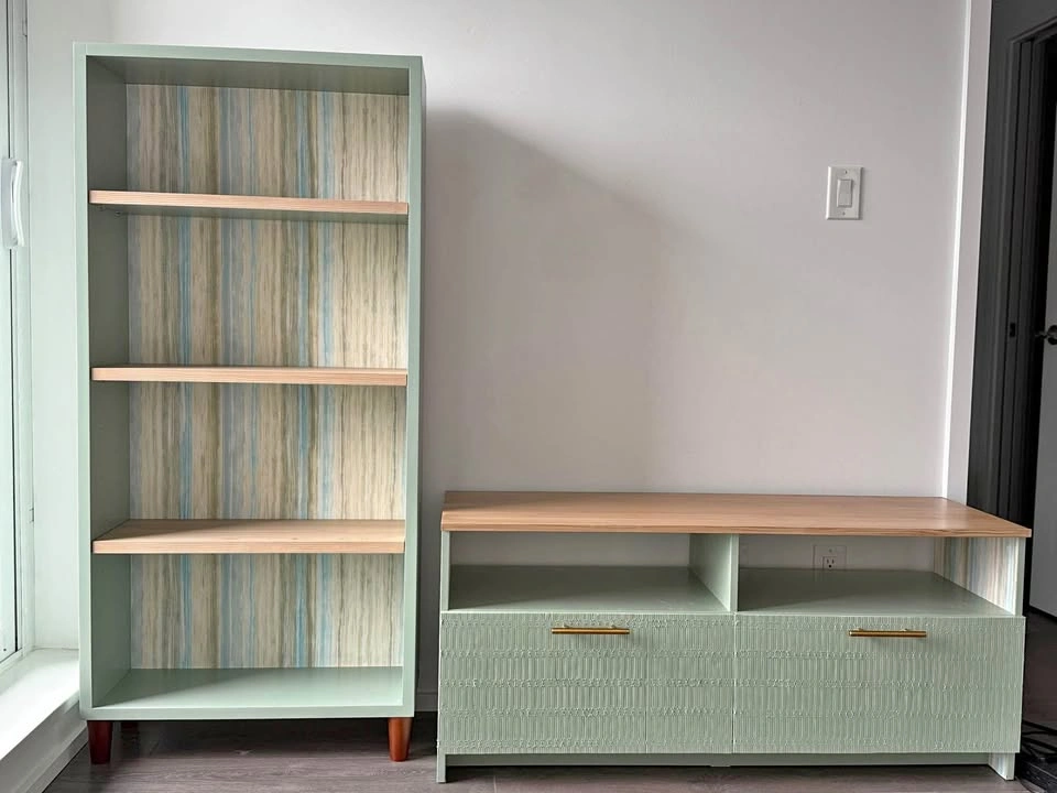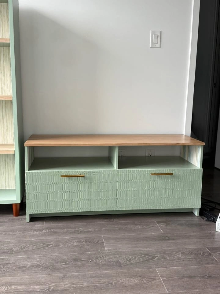 Tv stand/ media console and a bookshelf Unique, handcrafted set that blends modern design with a cozy coastal vibe. Finished in a soft mint green with warm wooden tops and accents, this duo brings both style and function to your space. Custom Bookshelf – 2-in-1 Shelves Handmade mint green bookshelf with striped aqua/beige backing. Shelves are interchangeable — flip to mint or wood texture for different looks. Perfect for books, plants, or décor. TV Stand / Media Console TV stand in mint green with a natural wood top. Features 2 open cubbies + 2 large drawers with gold handles for extra storage. Stylish and functional centerpiece for your living room. Pick up near Brentwood Mall