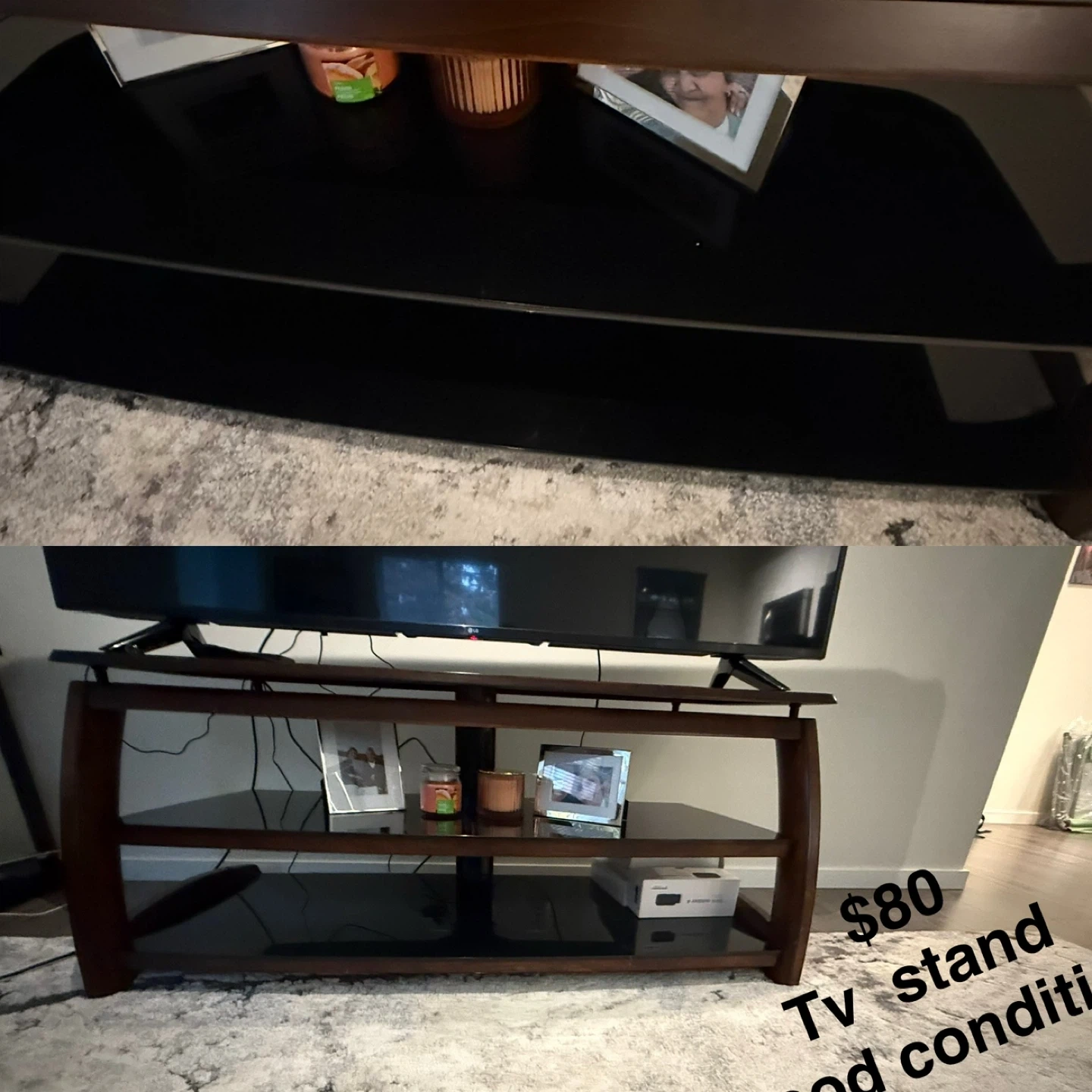 18Selling a TV stand in good condition. It features a dark wood frame with black glass shelves, offering a sleek look for your living room. A great piece to display your TV and store media!
