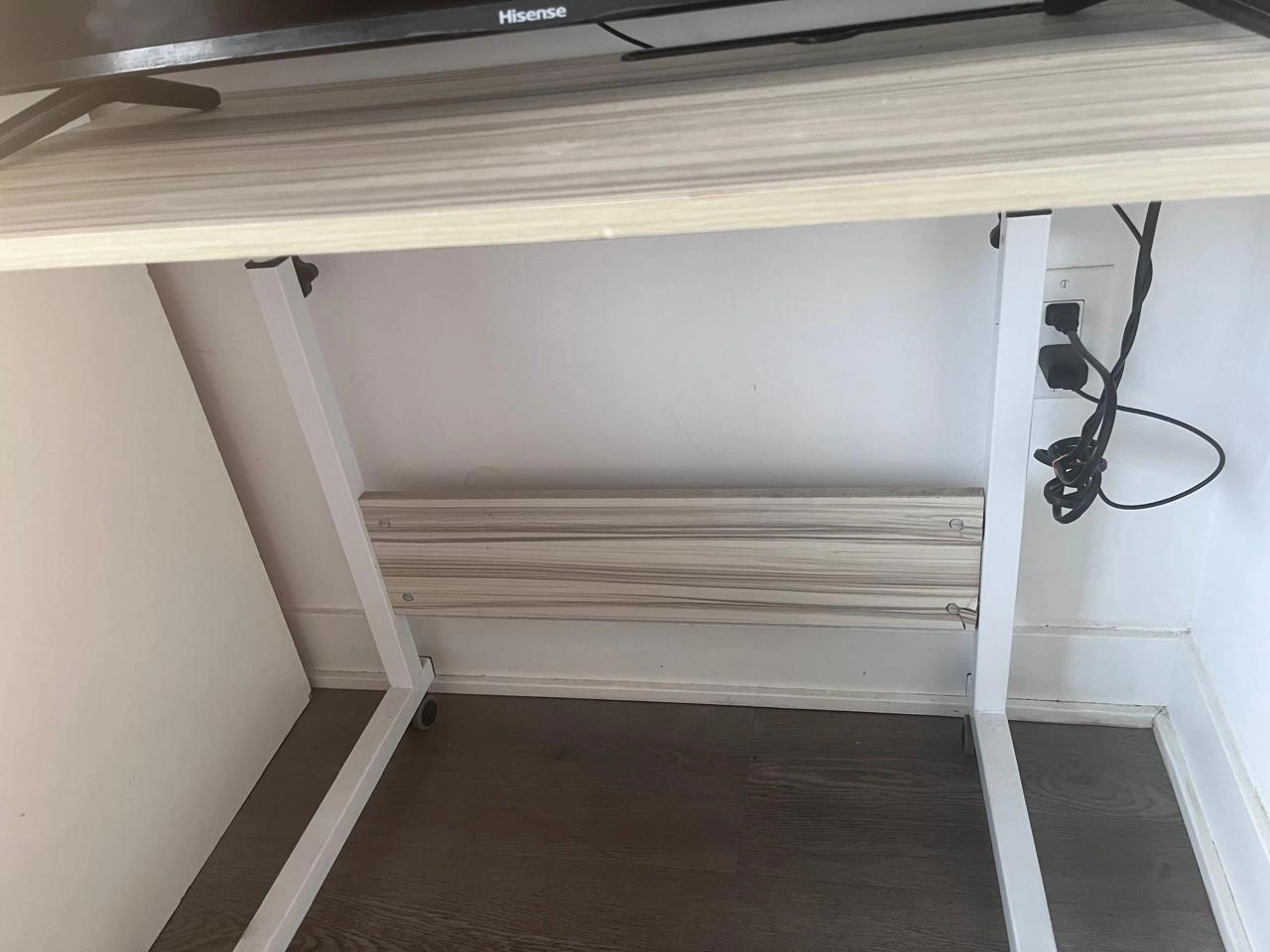 Selling a TV stand. It's in great condition and perfect for your living room setup. The stand is sturdy and provides ample support for your TV and use like a study table. It has a clean, modern design that will complement any decor. Feel free to reach out if you're interested!