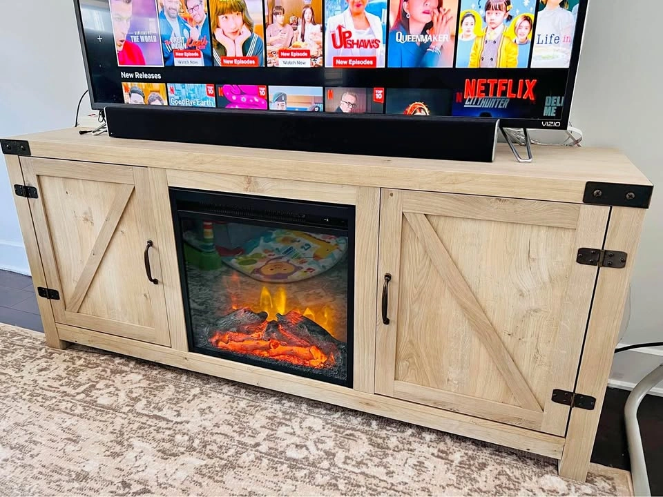TV stand with Beautiful Heated Fireplace. Spend cozy evenings with family. Fits TV of up to 65”. No scratches, still as new.