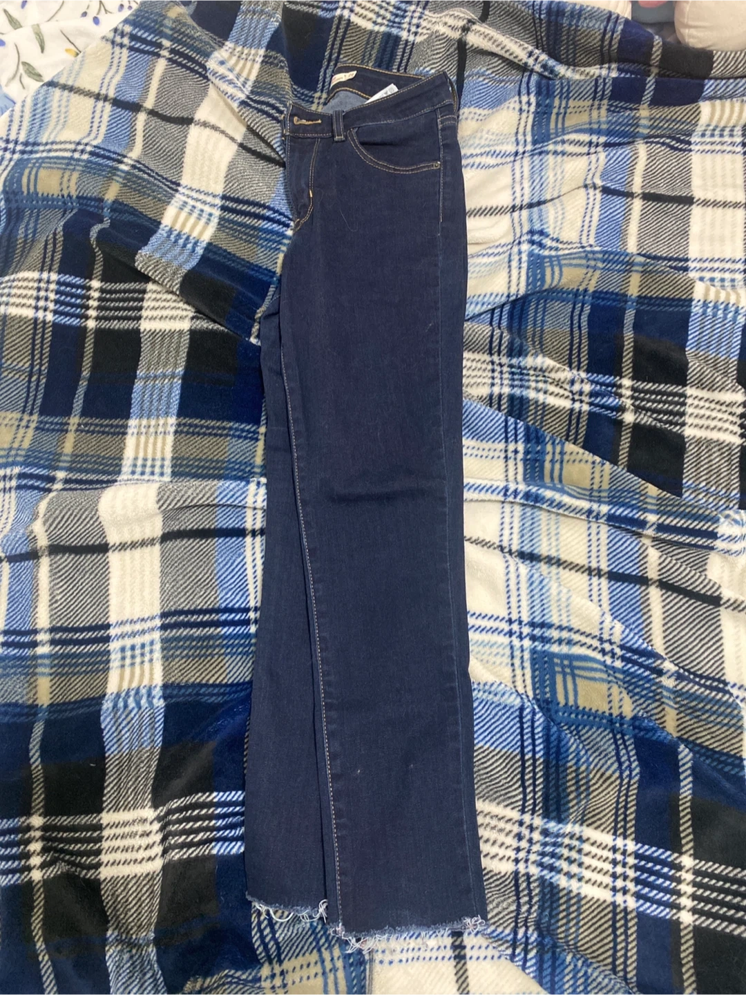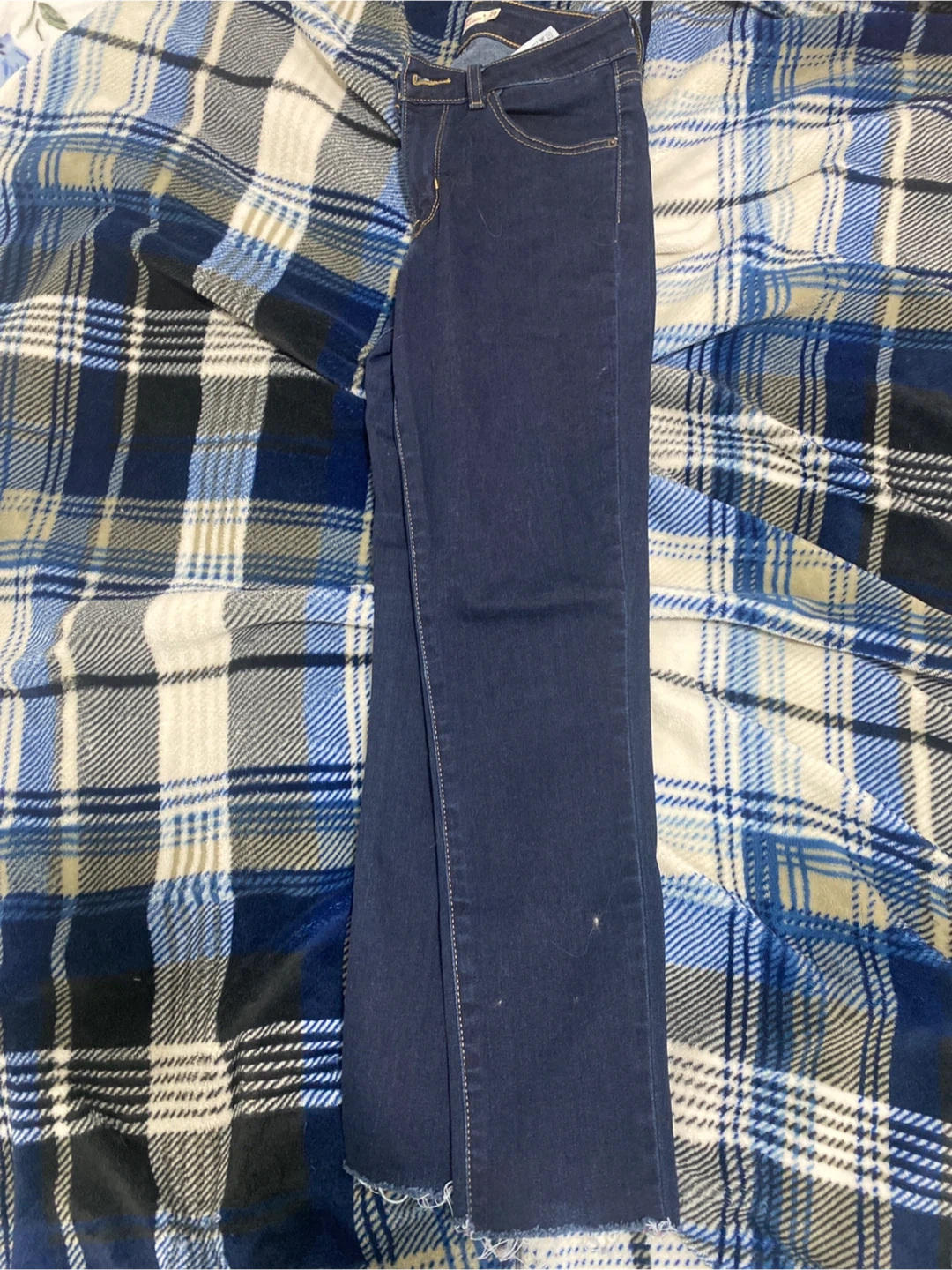 Classic Levi's women's jeans in a dark wash denim. They feature a frayed hem for a modern look. Made from comfortable denim material. Pick up cash only