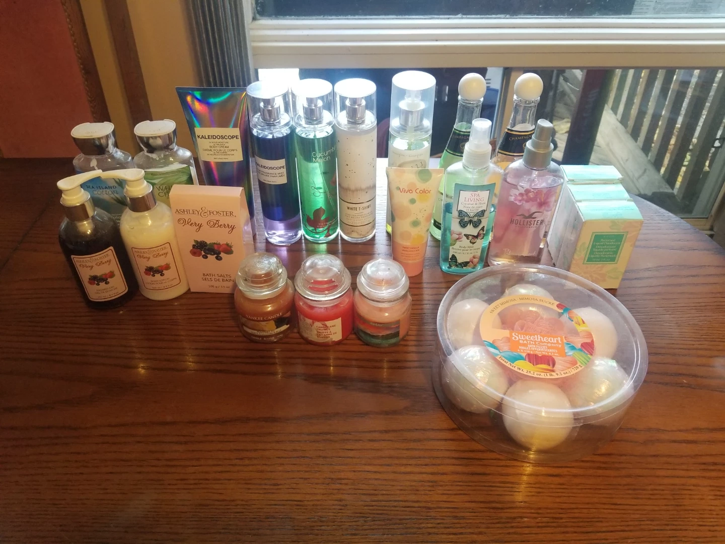 A collection of bath and body products including lotions, body mists, bath salts, and bath bombs. Includes Ashley & Foster Very Berry items, Yankee Candles, and Bath & Body Works Sweetheart bath bombs. Some items are full-sized.