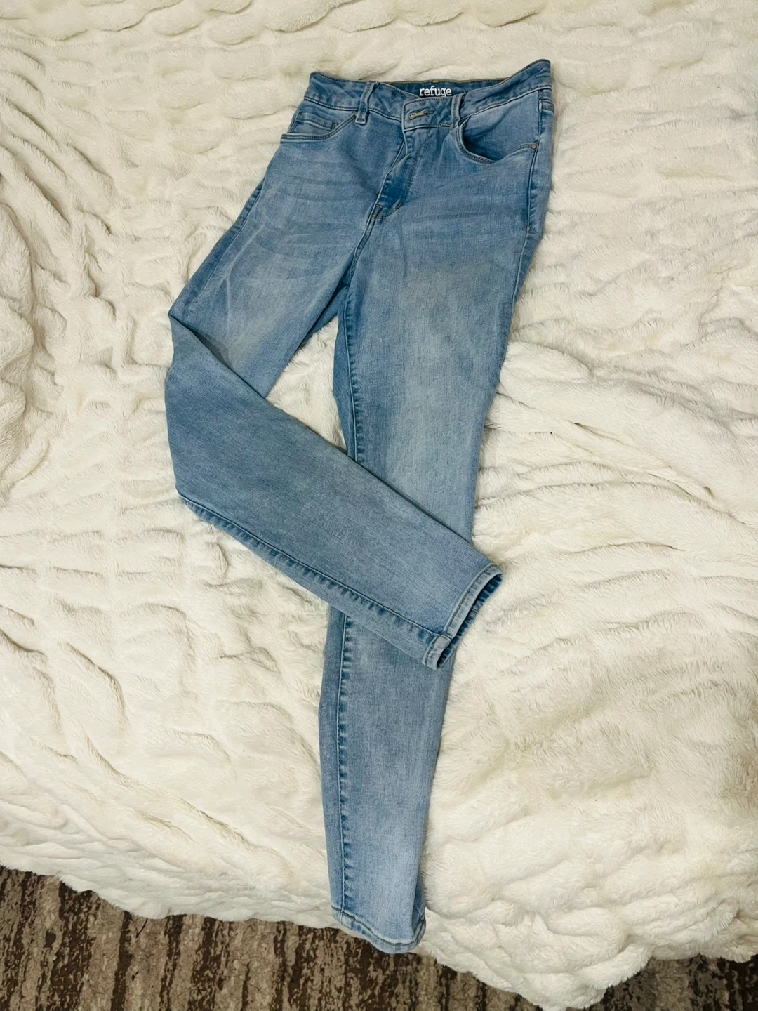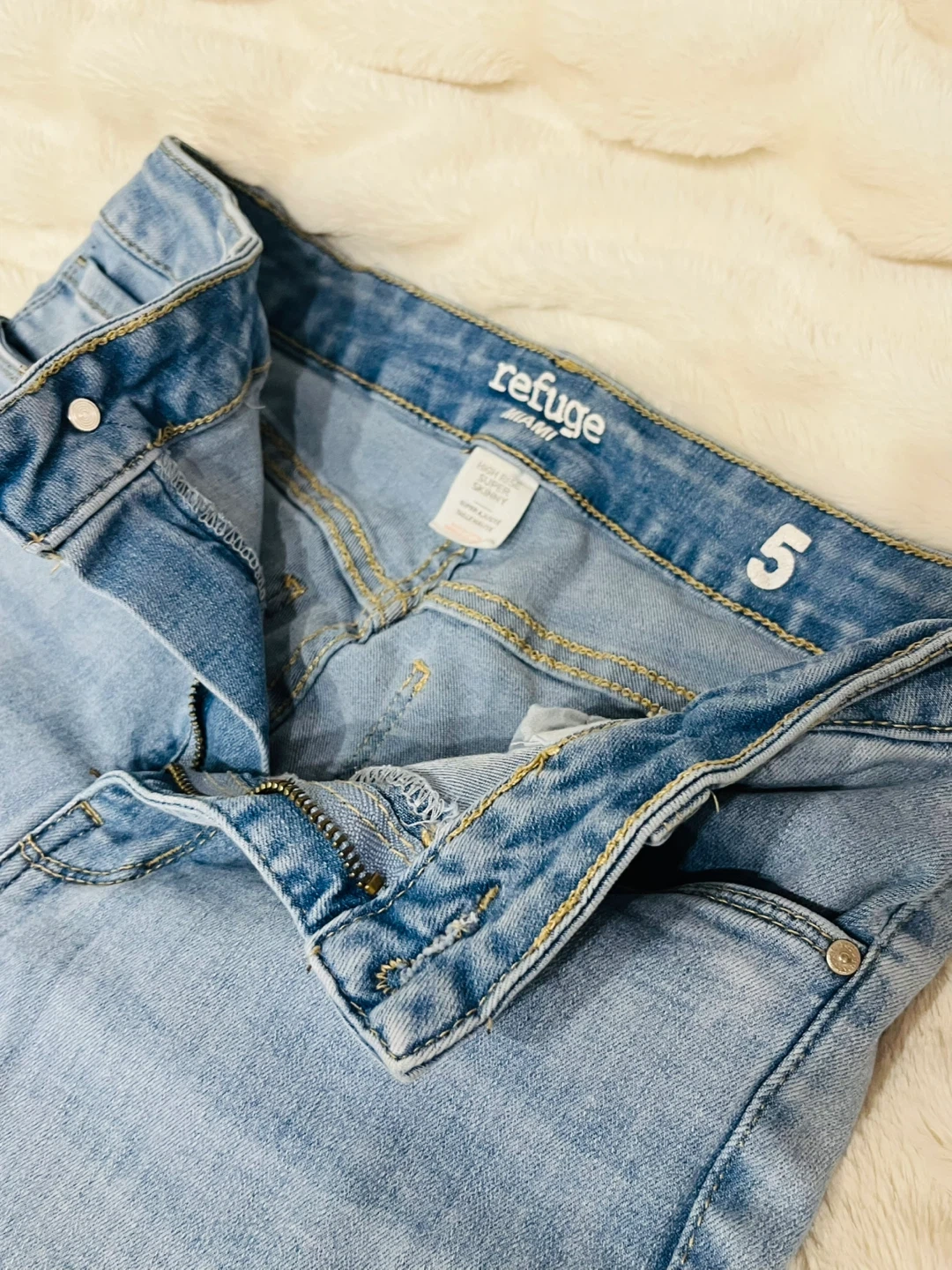 Refuge Miami skinny jeans in a light wash. Size 5, with a zipper fly. Made from denim material. Some stretch.