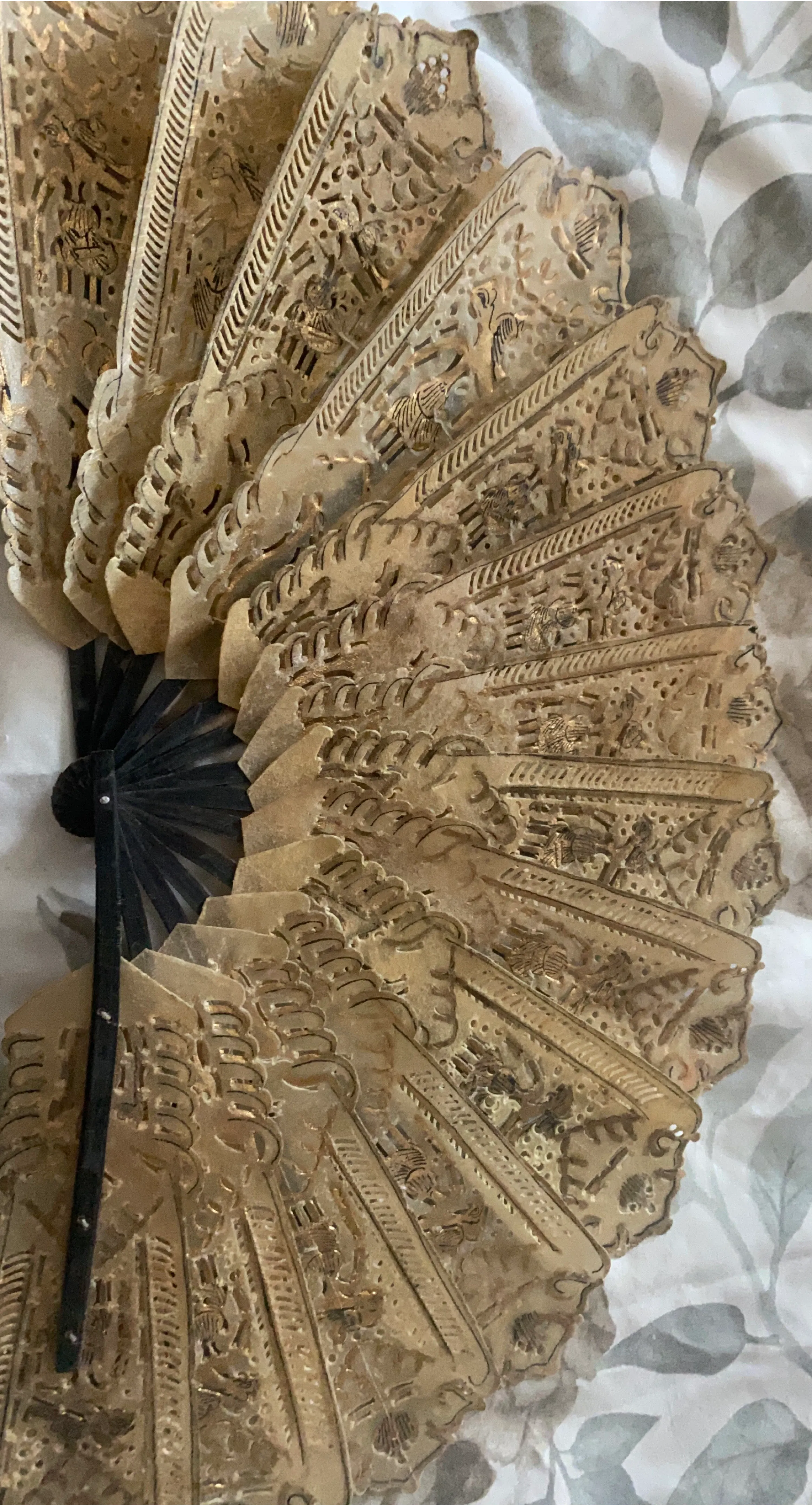 This is a beautiful vintage folding fan, intricately carved with detailed scenes. It's made of a lightweight, parchment-like material with a black handle. When opened, it expands to create a lovely display.