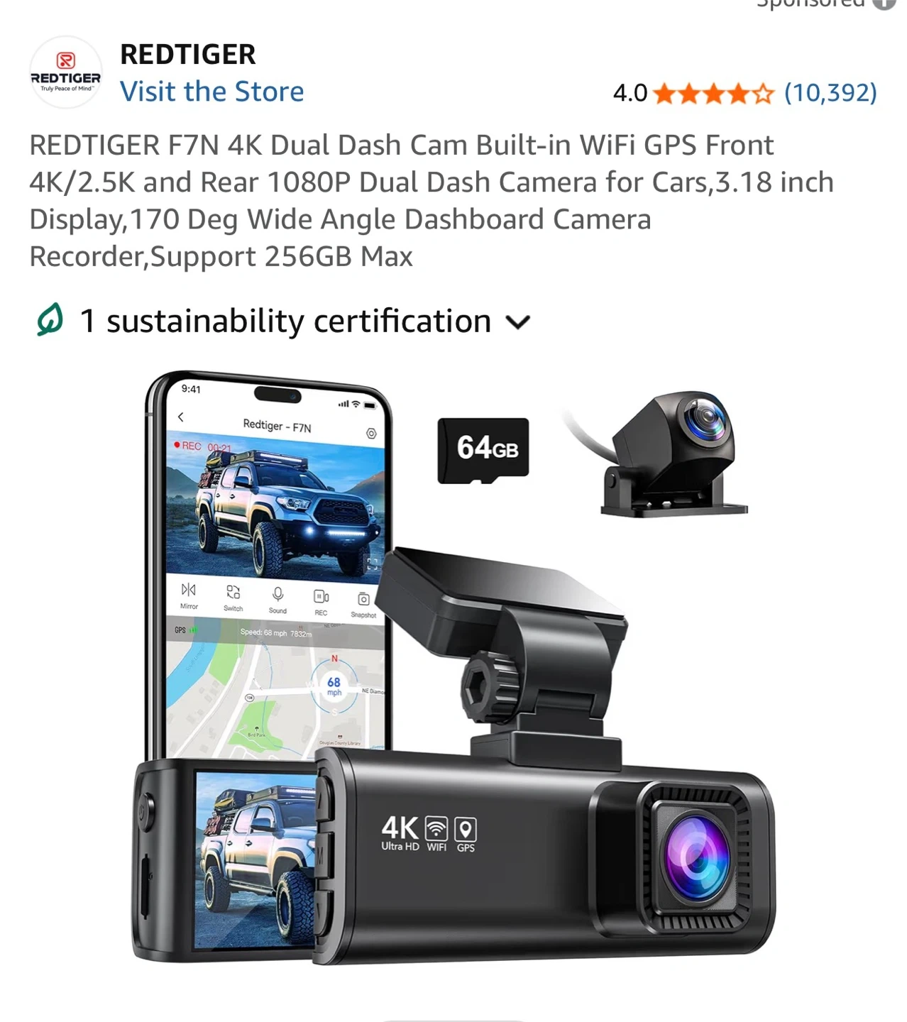 This RED TIGER F7N dash cam records in 4K Ultra HD with GPS tracking. It features app control for easy access to recordings and footage. It supports up to 256GB max storage. This camera offers a 170-degree wide-angle view of the road.