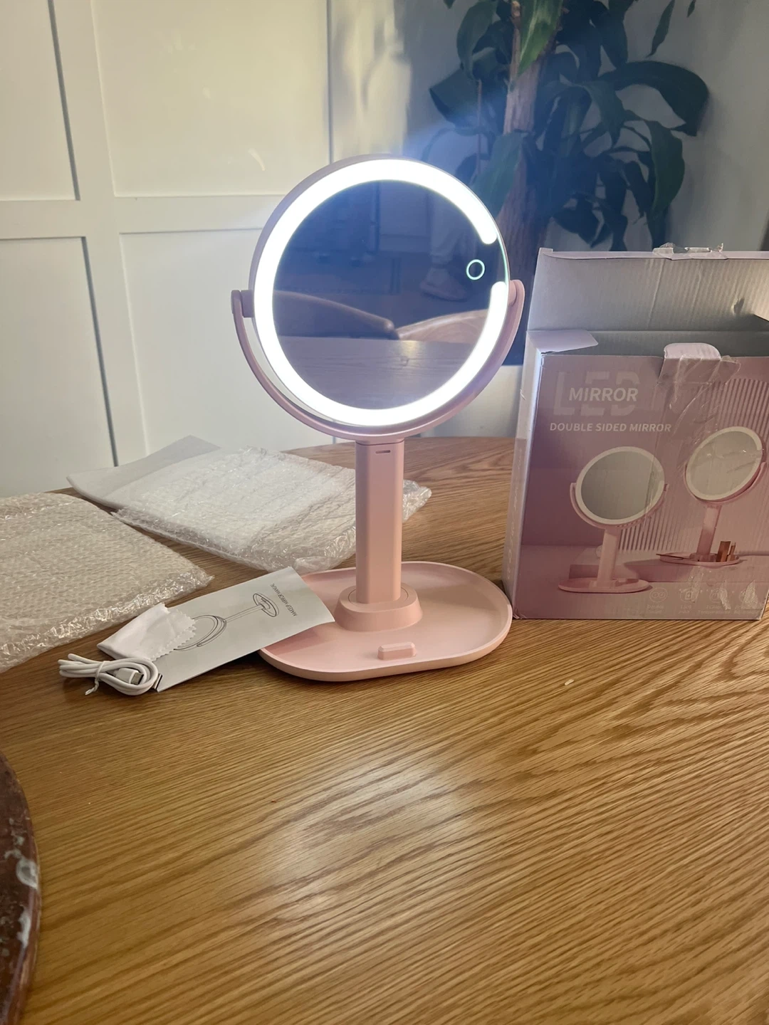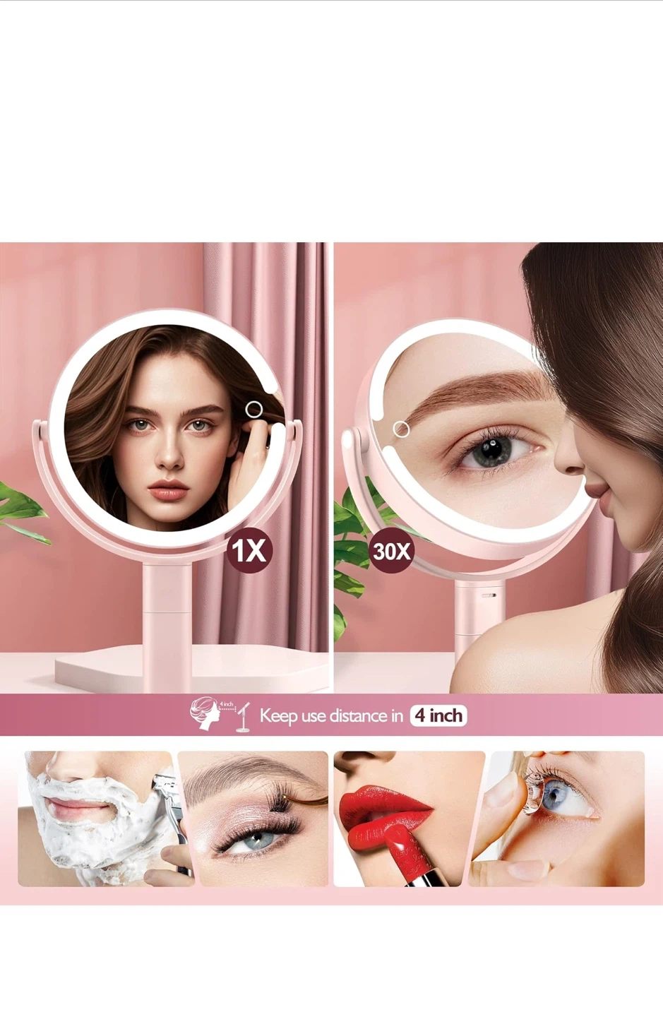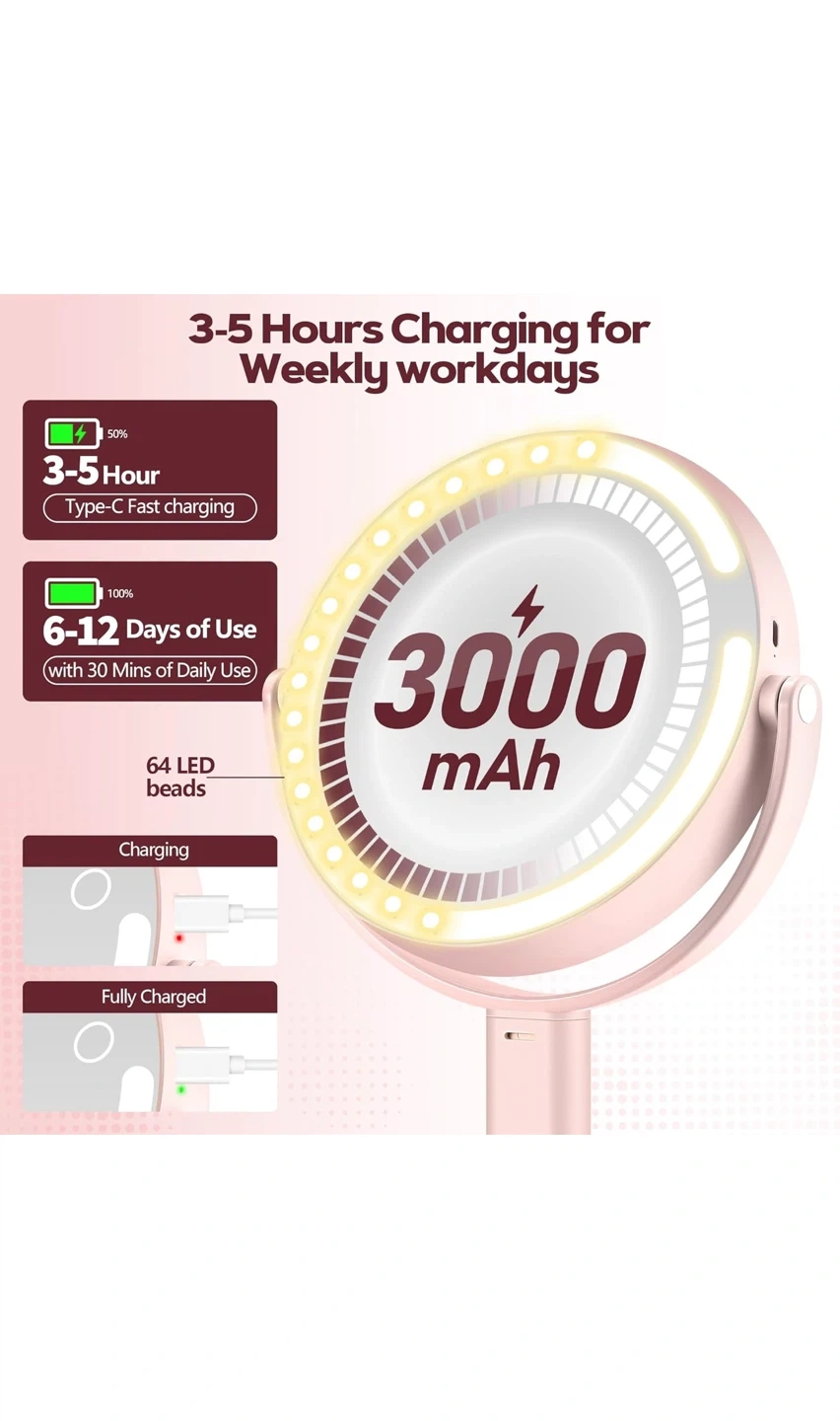 This pink LED makeup mirror offers 1X and 30X magnification options. It features 3 color lights (cold, natural, warm) and adjustable brightness with 64 high-efficiency LEDs. The rechargeable 3000 mAh battery provides 6-12 days of use after a 3-5 hour charge. Includes a USB Type-C charging cable. Great for detailed makeup application!