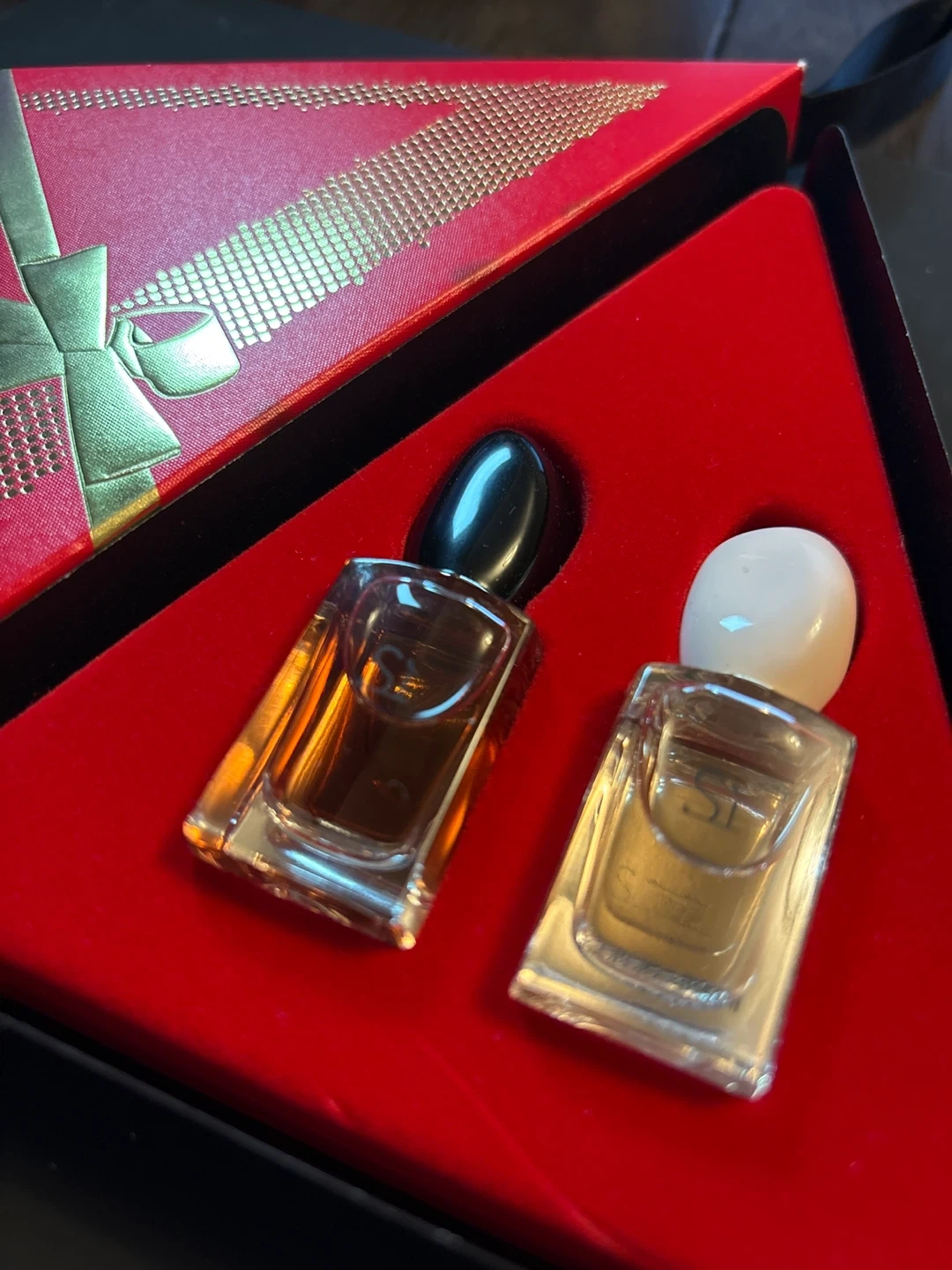 This set features two miniature fragrances from Giorgio Armani, Si Eau de Parfum and Si Eau de Toilette. Each bottle contains 7 ml / 0.24 fl. oz. of perfume. They're presented in a festive red gift box.