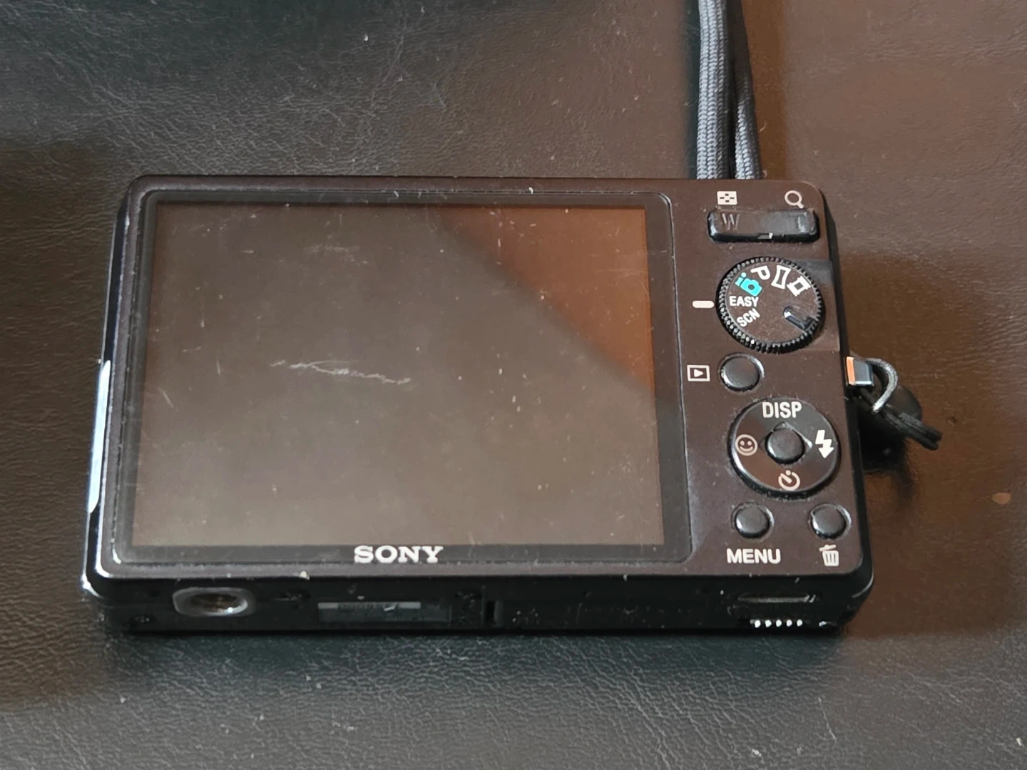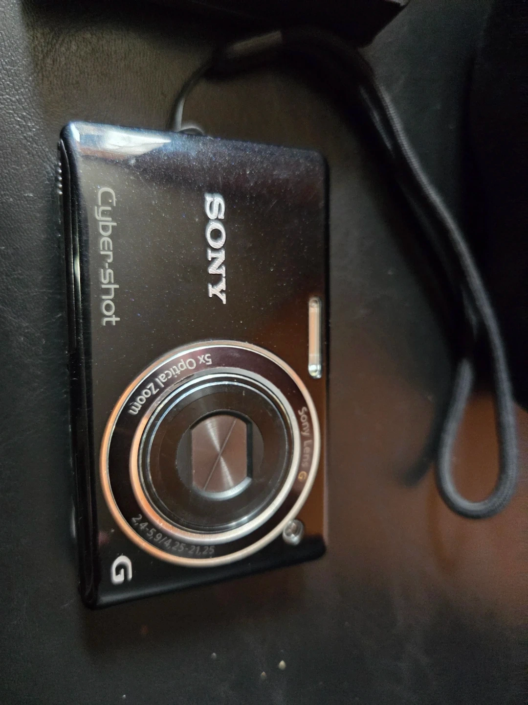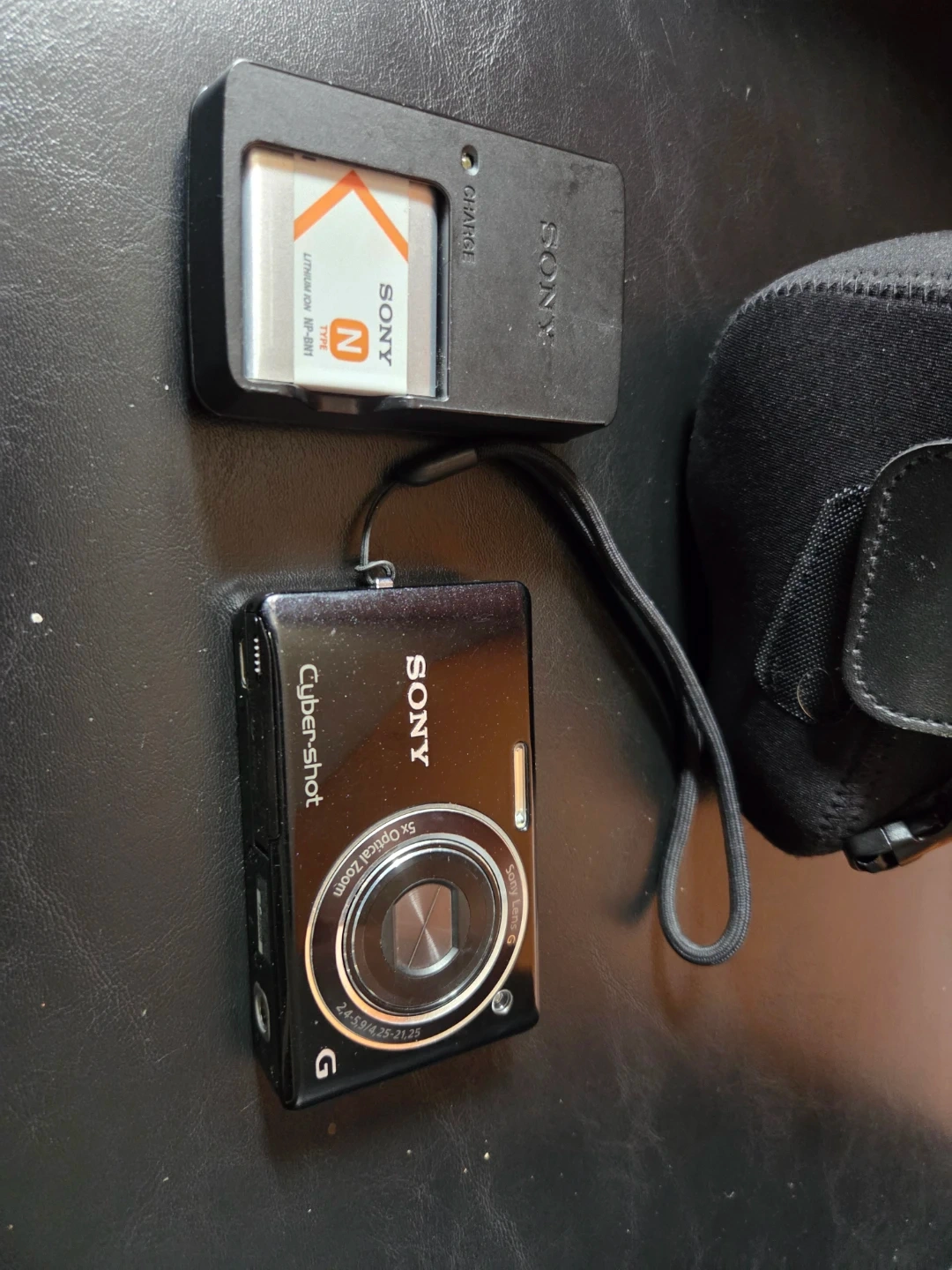 This is a black Sony Cyber-shot digital camera. It features a 5x optical zoom lens. Includes a charger and a protective case. No memory card or cables. Battery, charger and camera are in working condition. Small scuff on monitor as seen in pictures. Still a good little camera.