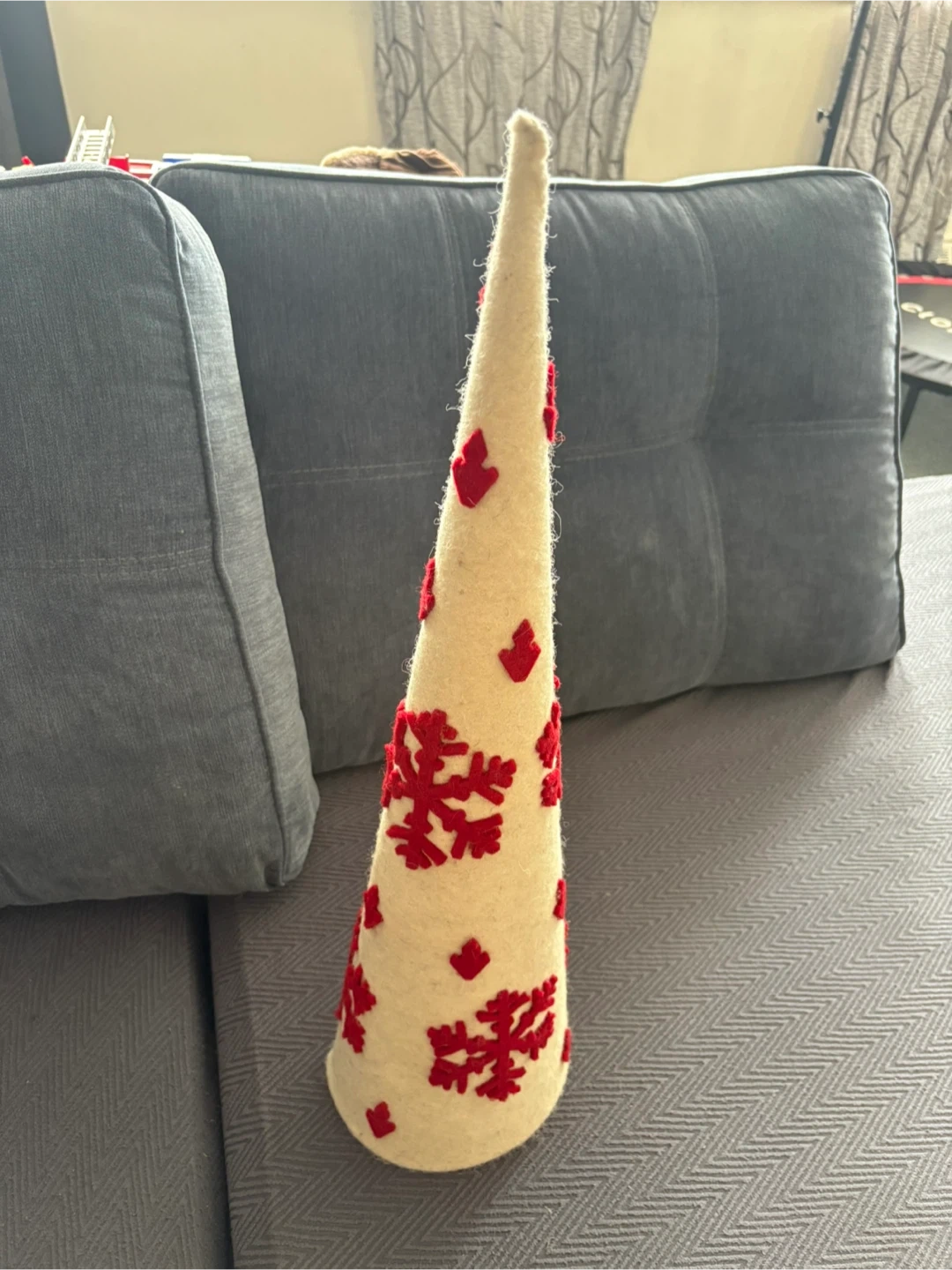 Cream-coloured felt decorative Christmas tree adorned with red felt snowflakes. It's a festive accent piece for holiday decorating. This tree is great for tabletops or mantels!