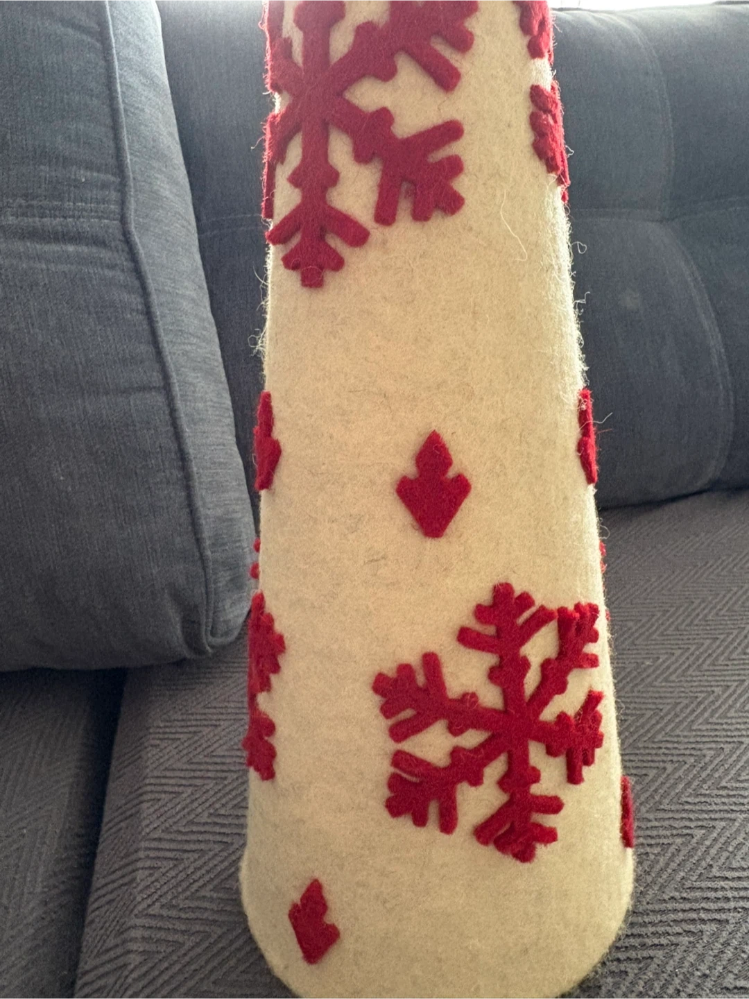Cream-coloured felt decorative Christmas tree adorned with red felt snowflakes. It's a festive accent piece for holiday decorating. This tree is great for tabletops or mantels!