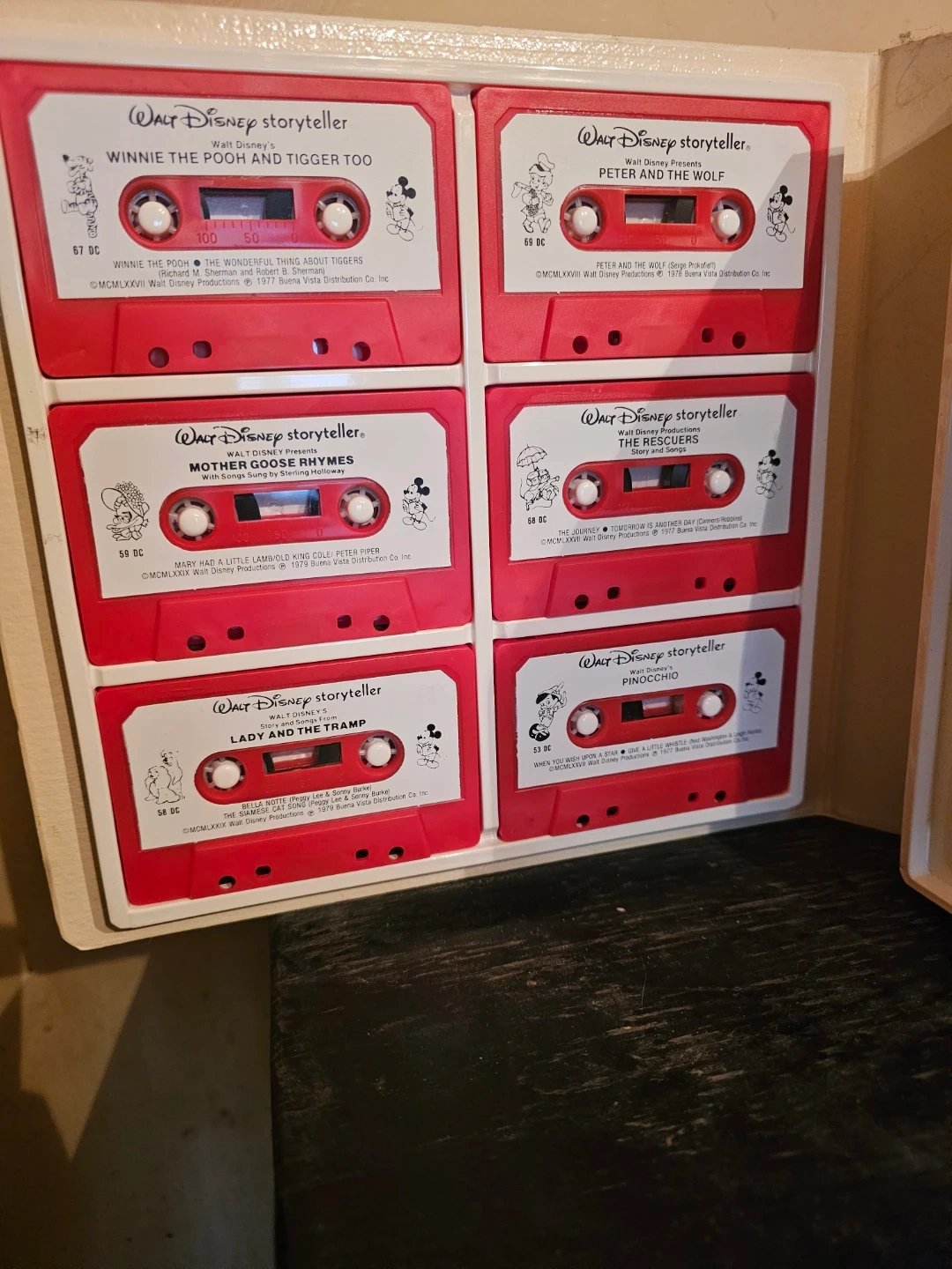 This set features classic Walt Disney Storyteller cassette tapes. It includes titles like 'Mother Goose Rhymes', 'Winnie the Pooh and Tigger Too', and 'Peter and the Wolf'. Great for sharing beloved Disney stories with kids!