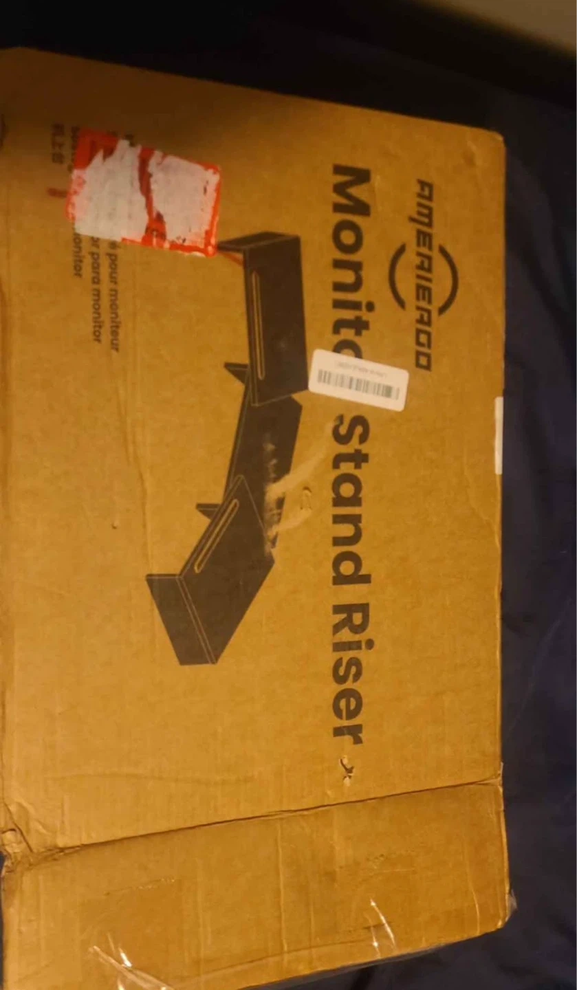 Ameriagoo monitor stand riser. Raises your monitor to a comfortable viewing height. Black metal construction. It needs to be put together all pieces are in the box