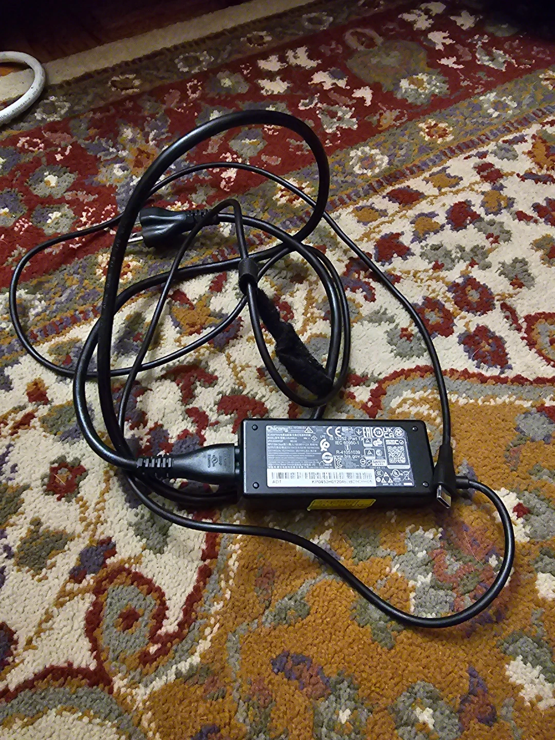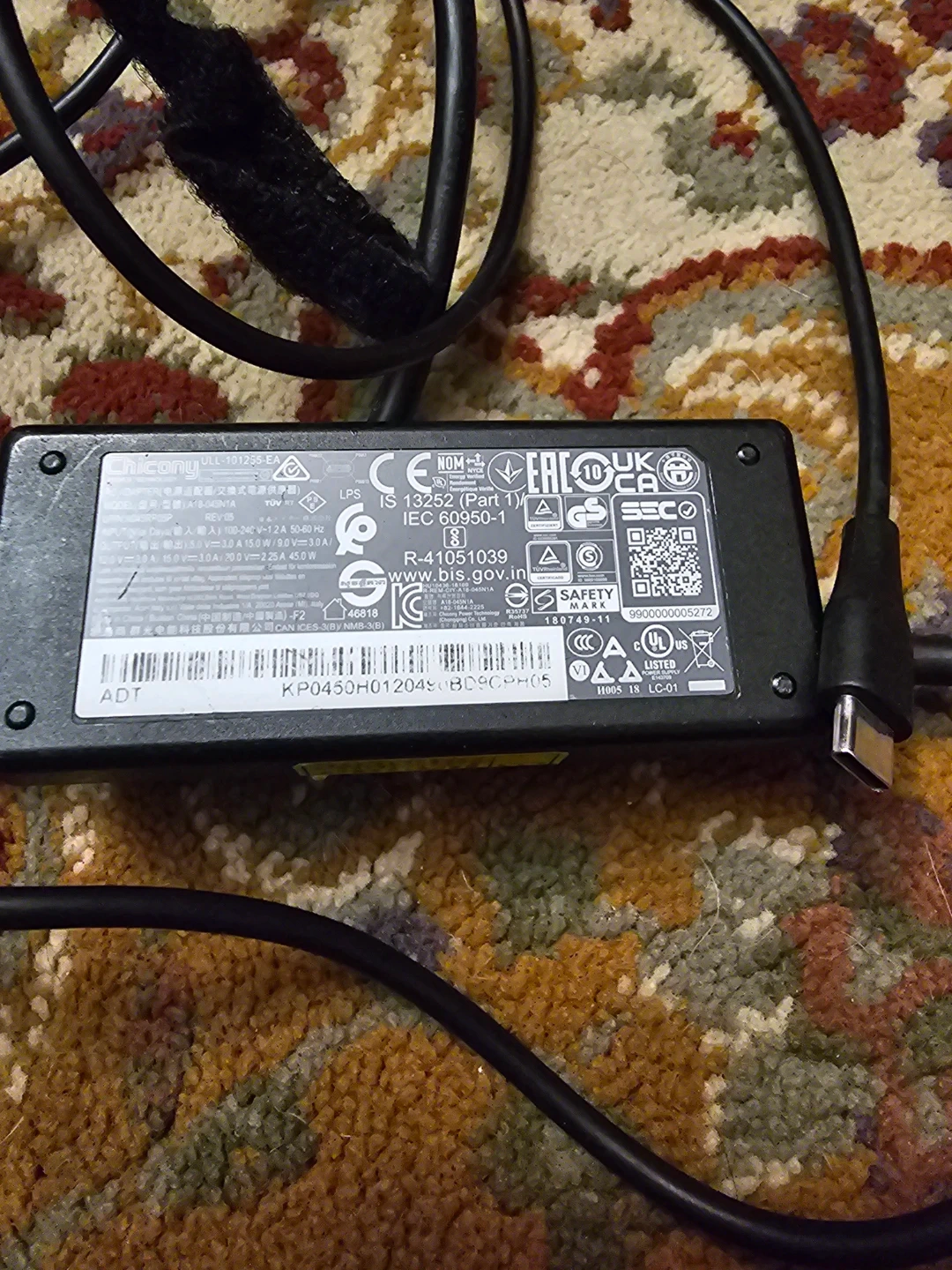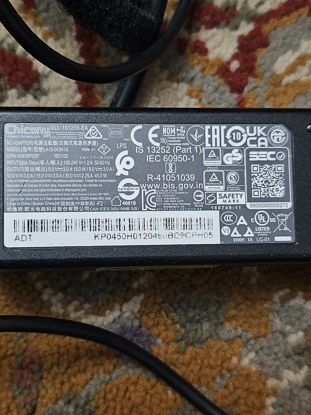 This is a Chicony ULL-101255-EA laptop power adapter. It has an input of 100-240V~1.2A 50-60 Hz and an output of 19.5V===3.0A, 15.0W/9.0V===3.0A. This adapter is suitable for charging laptops requiring these specifications.