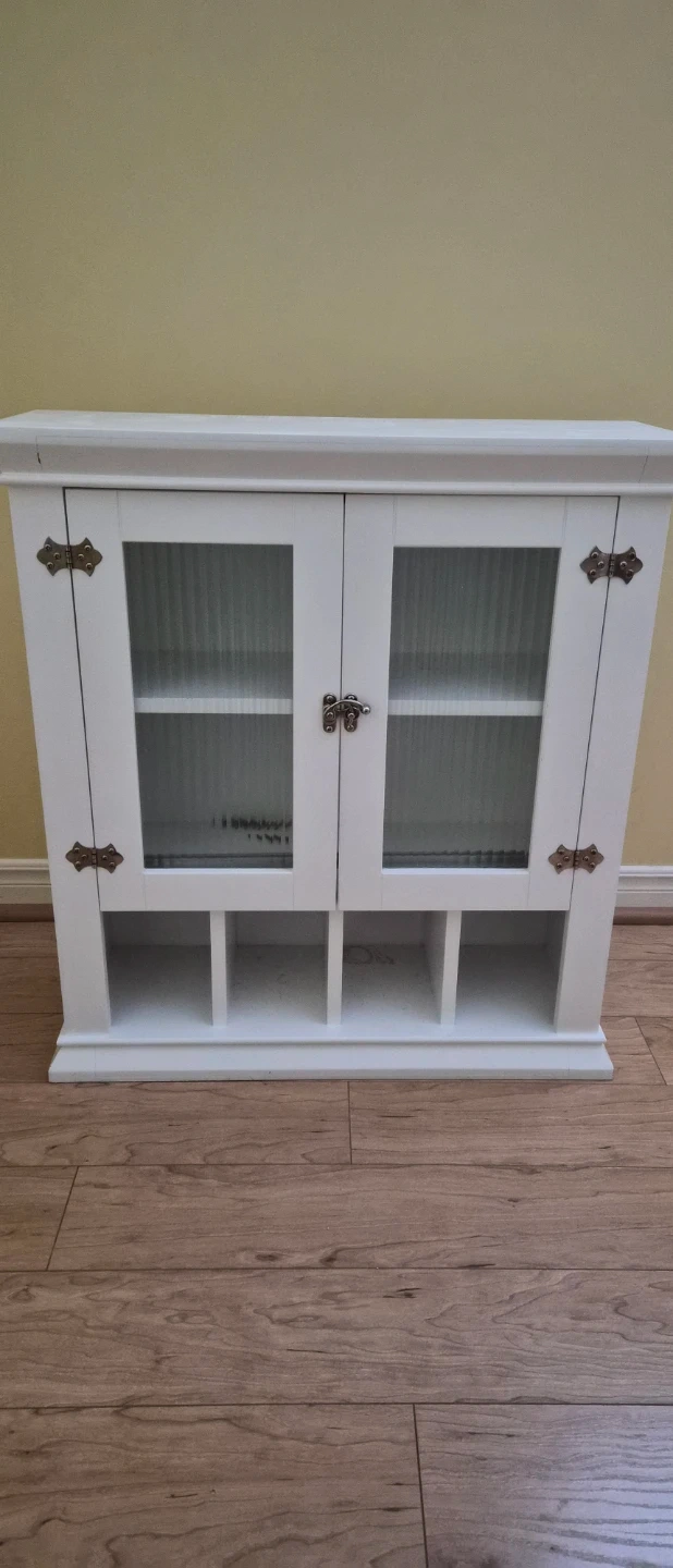 A white wall-mounted cabinet with two glass-fronted doors. It features two shelves inside the main compartment and six cubbies at the bottom. Hinges are antique brass style.