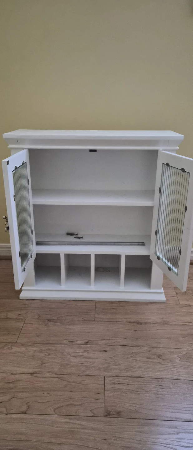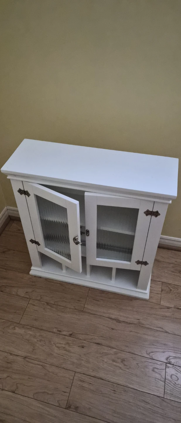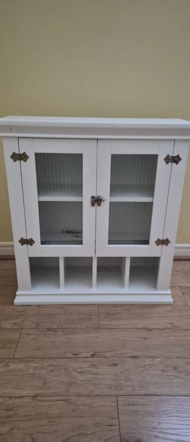 A white wall-mounted cabinet with two glass-fronted doors. It features two shelves inside the main compartment and six cubbies at the bottom. Hinges are antique brass style.