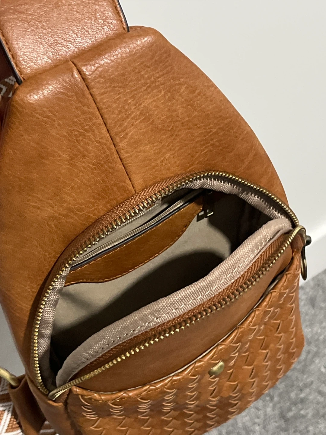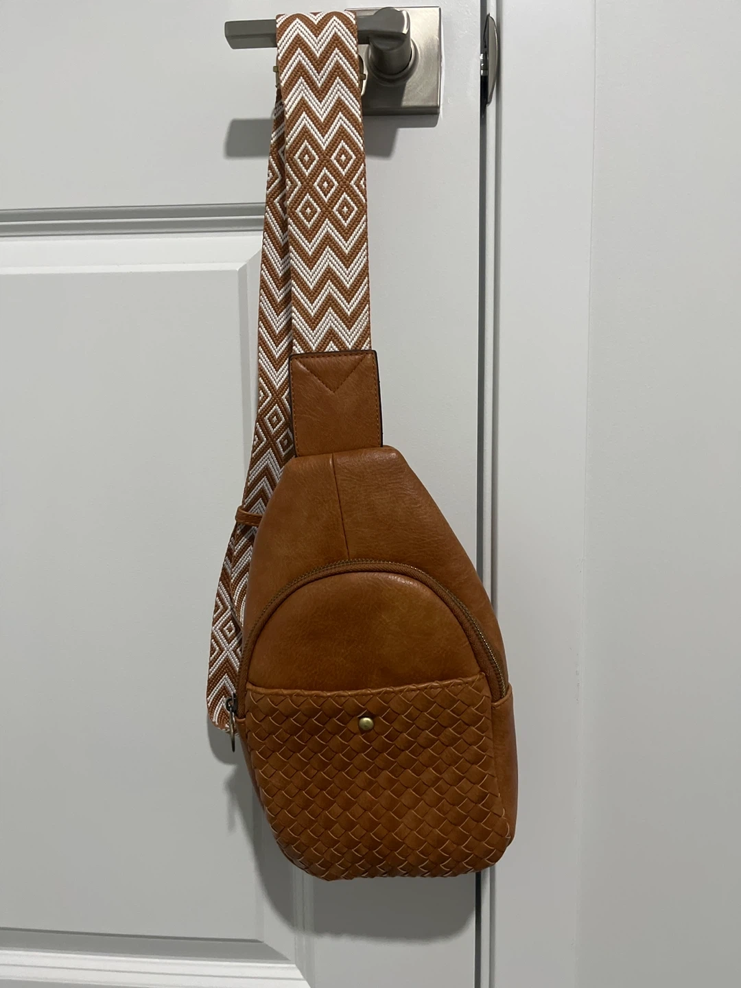 A stylish brown faux leather sling bag with a woven detail on the front pocket. It features a zippered main compartment and an adjustable patterned strap for comfortable wear. This bag is perfect for carrying essentials on the go!