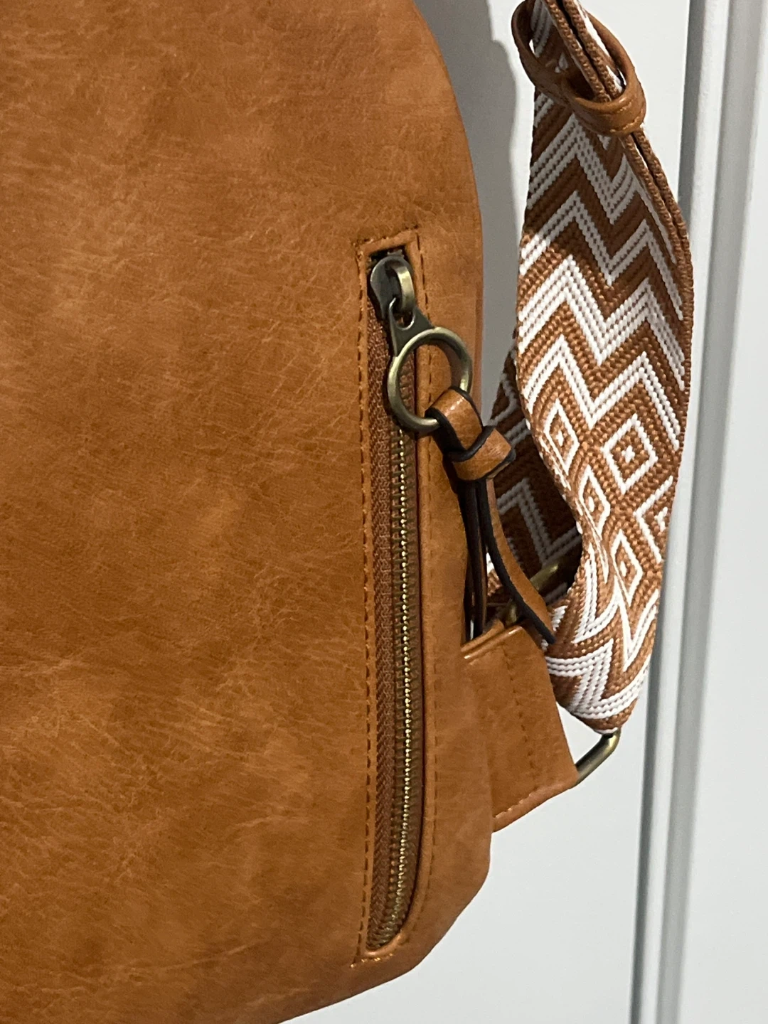 Brown Faux Leather Sling Bag with Patterned Strap