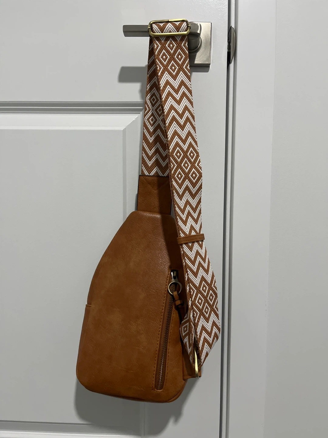 Brown Faux Leather Sling Bag with Patterned Strap