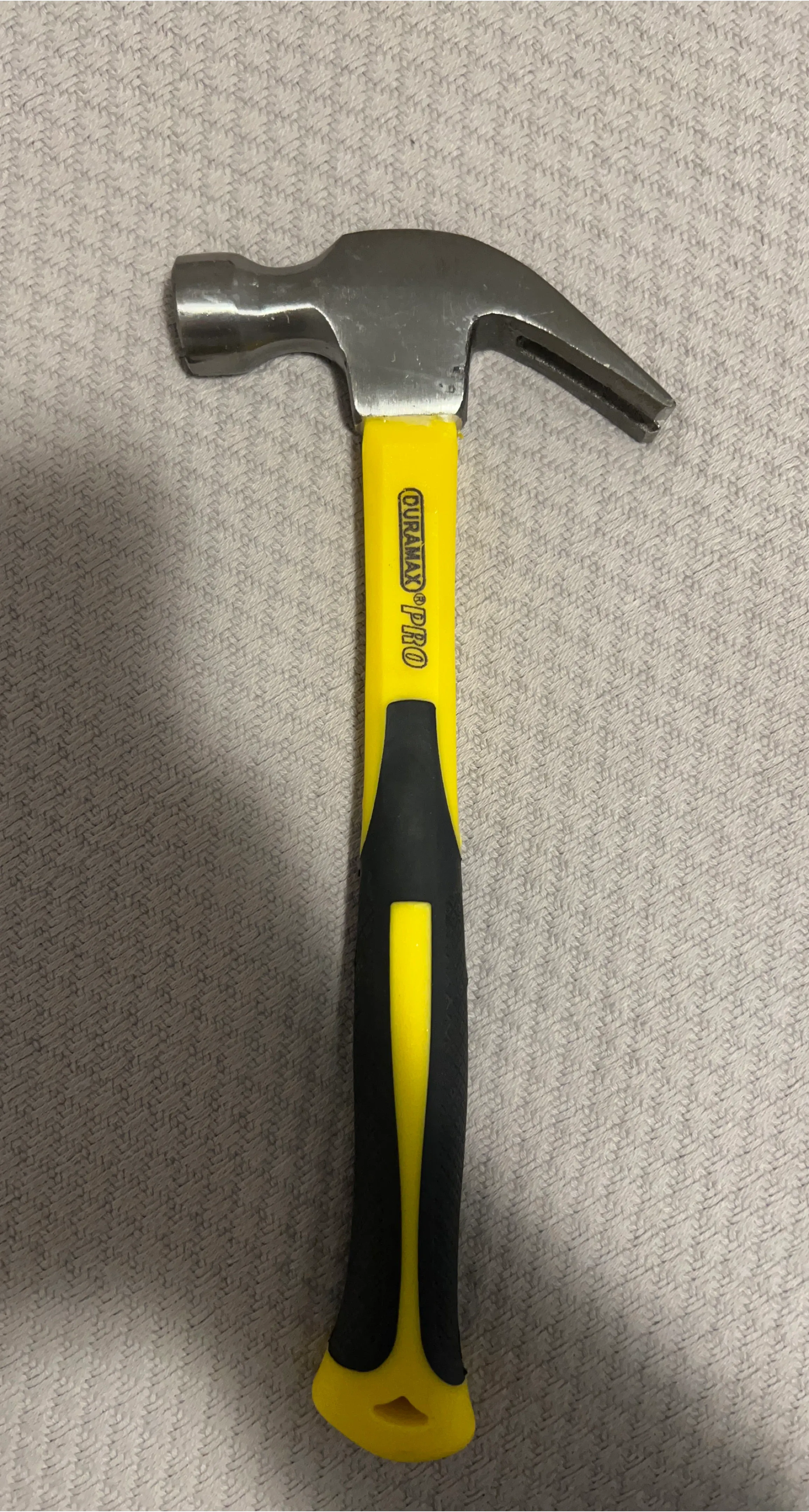 This is a DURAMAX PRO claw hammer. It has a yellow and black handle for a comfortable grip. The hammer head is made of metal.