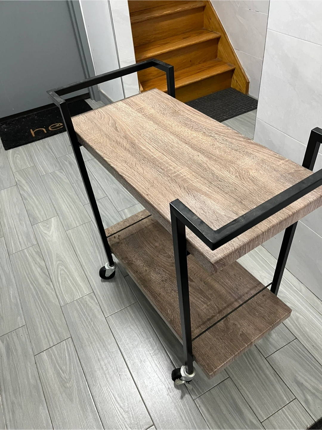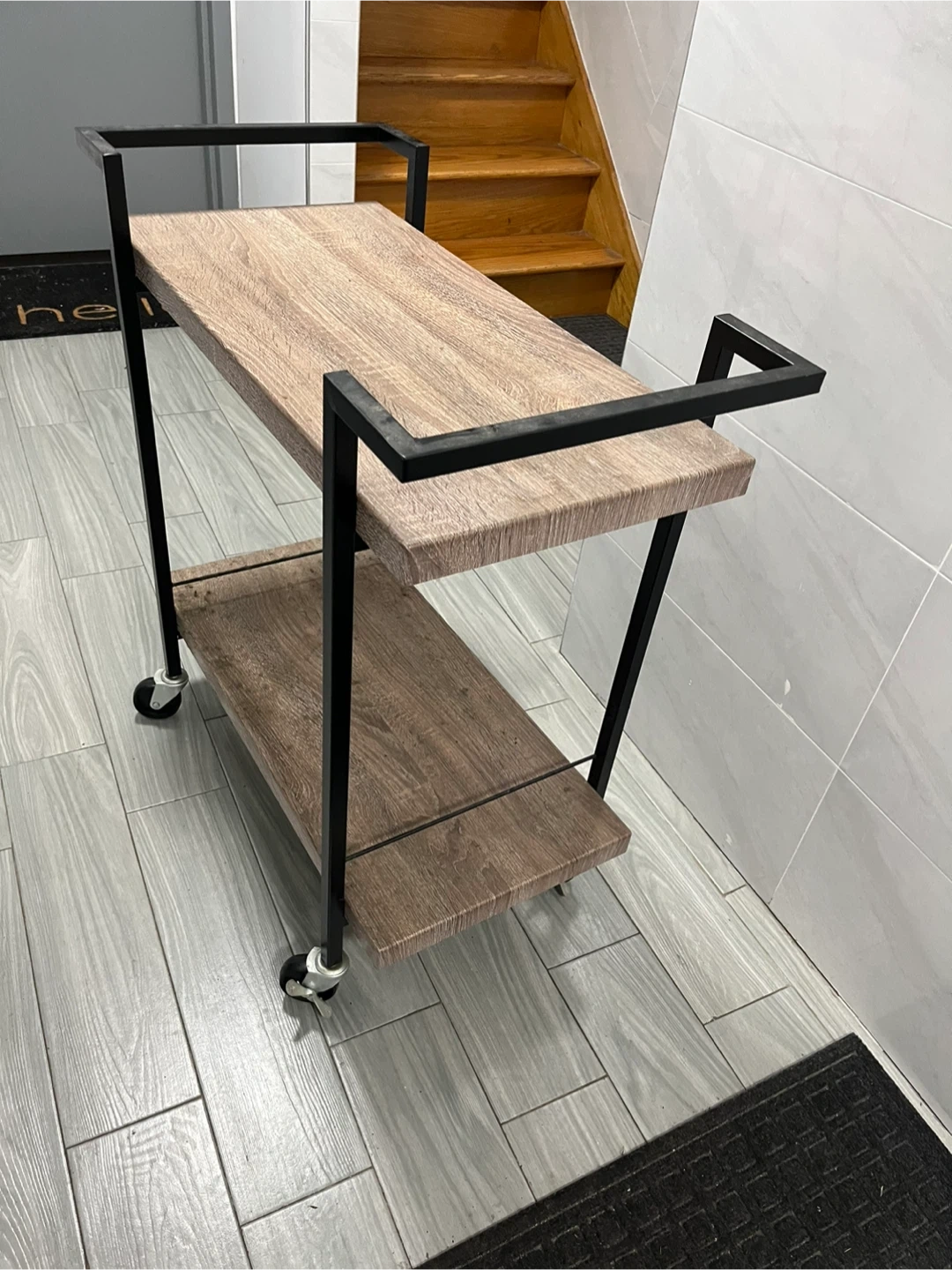 This bar cart features a wood grain finish and black metal frame. It has two shelves and wheels for easy mobility. Perfect for serving drinks or as extra storage!