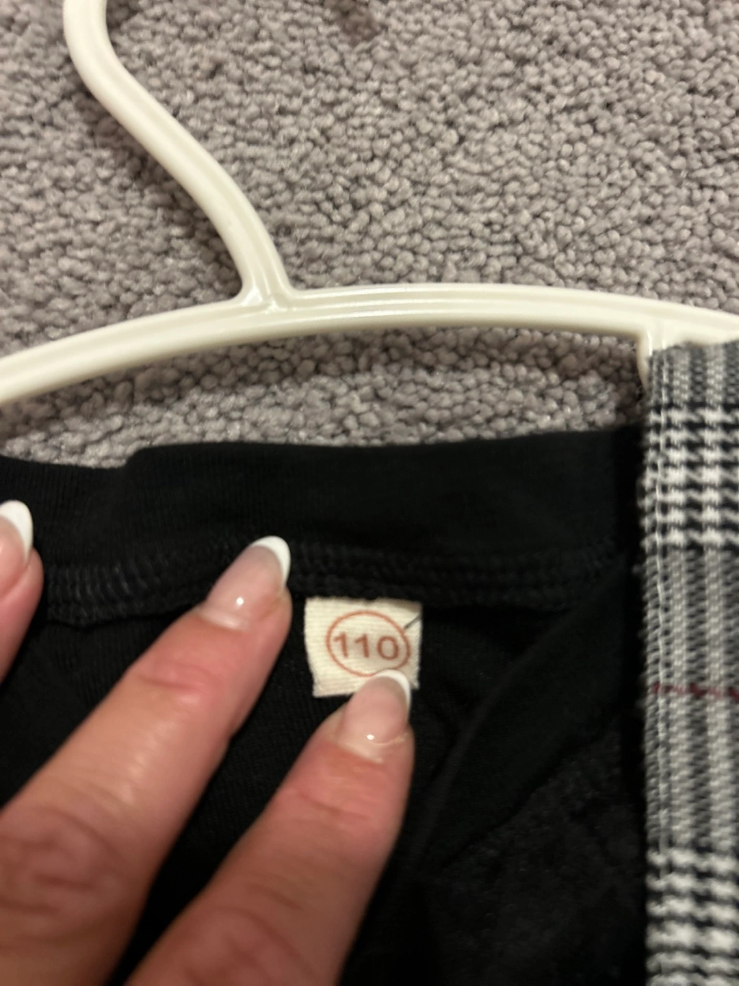 Cute little outfit for your little one! This is a girl's set featuring a black long-sleeved top with lace detailing and a plaid skirt with suspenders. The size is 110.